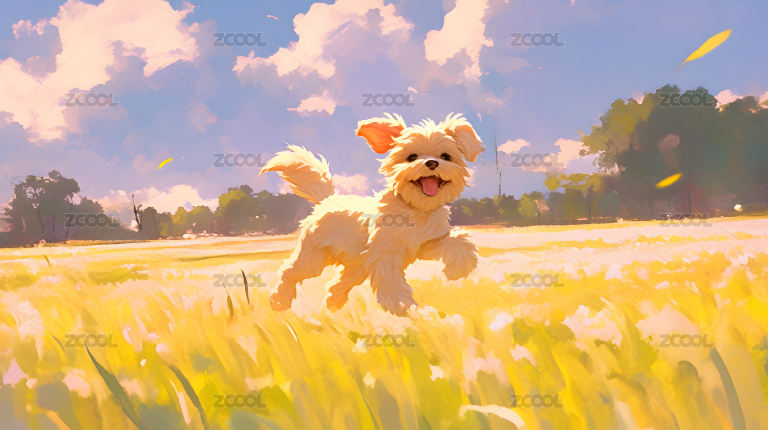 自然,小狗,插画,漫画,动漫,日漫,白色,奔跑,草地,蓝天