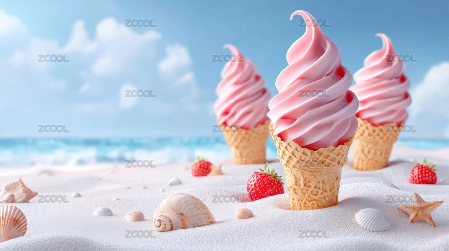 冰激凌海报,蓝天沙滩背景