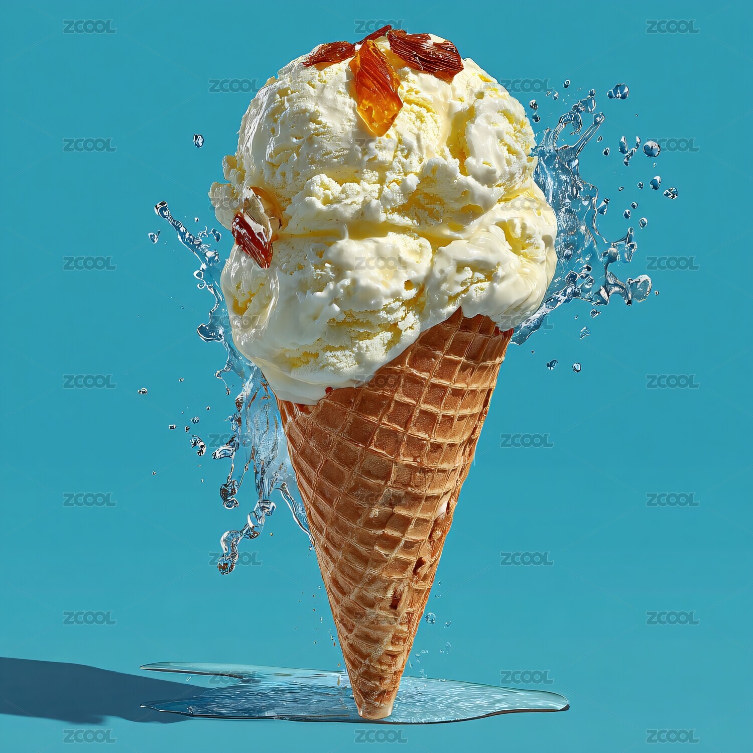 飞溅水花的美味冰淇淋甜筒