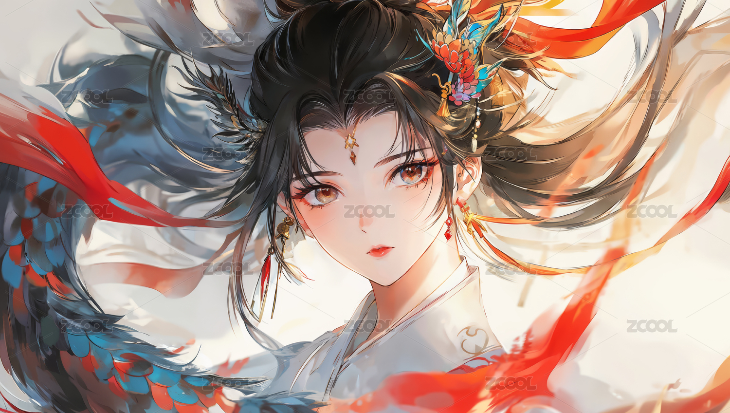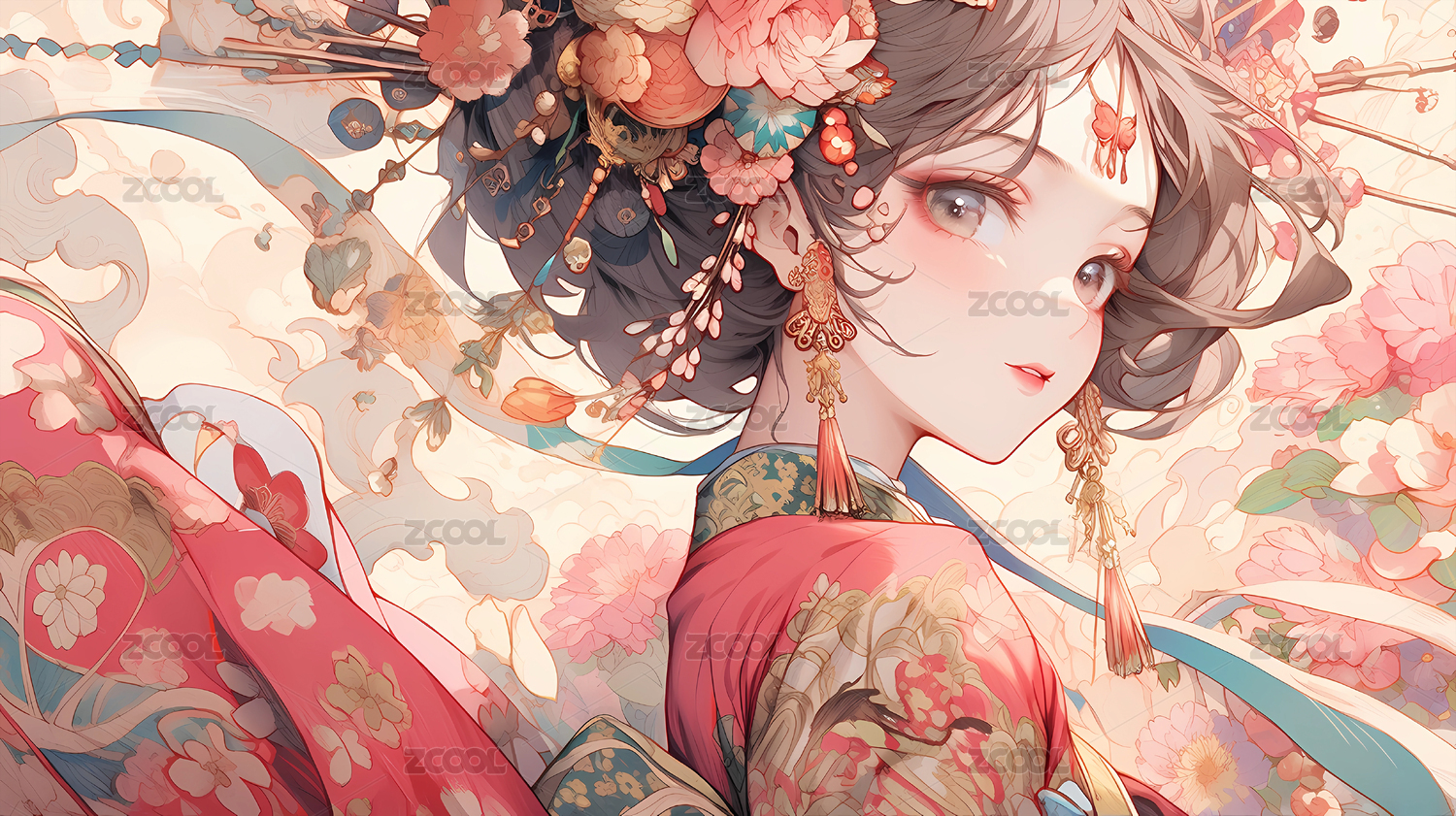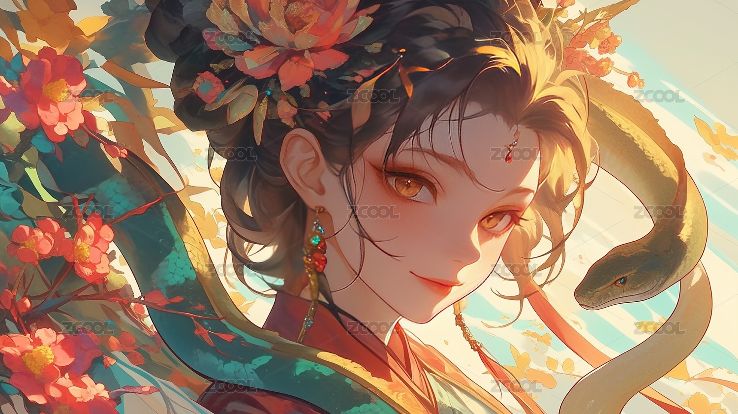 一位装饰着鲜艳花朵的女孩和飞鸟