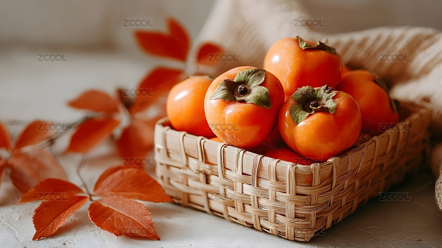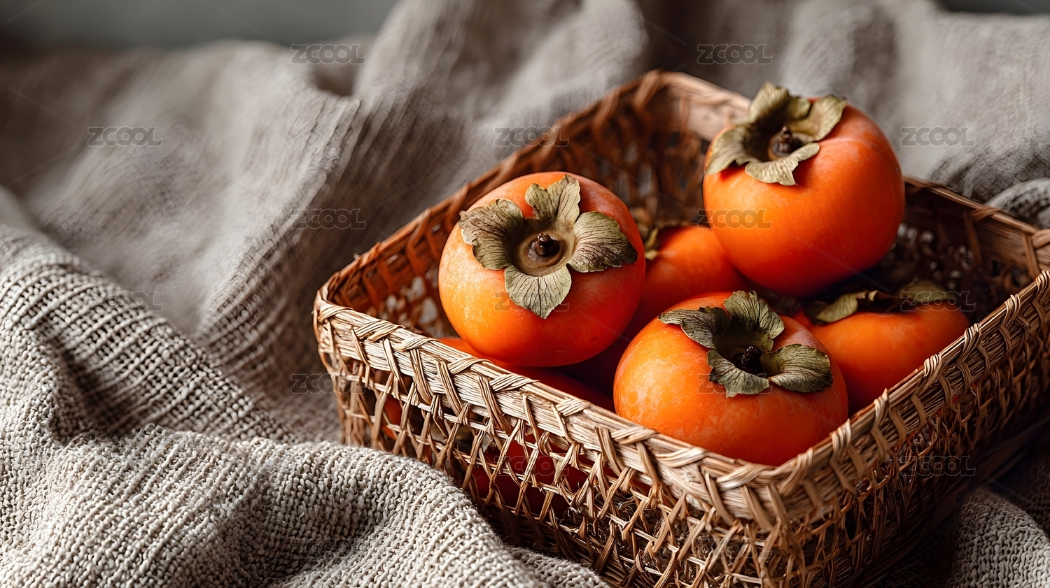 新鲜柿子摆放在竹篮中