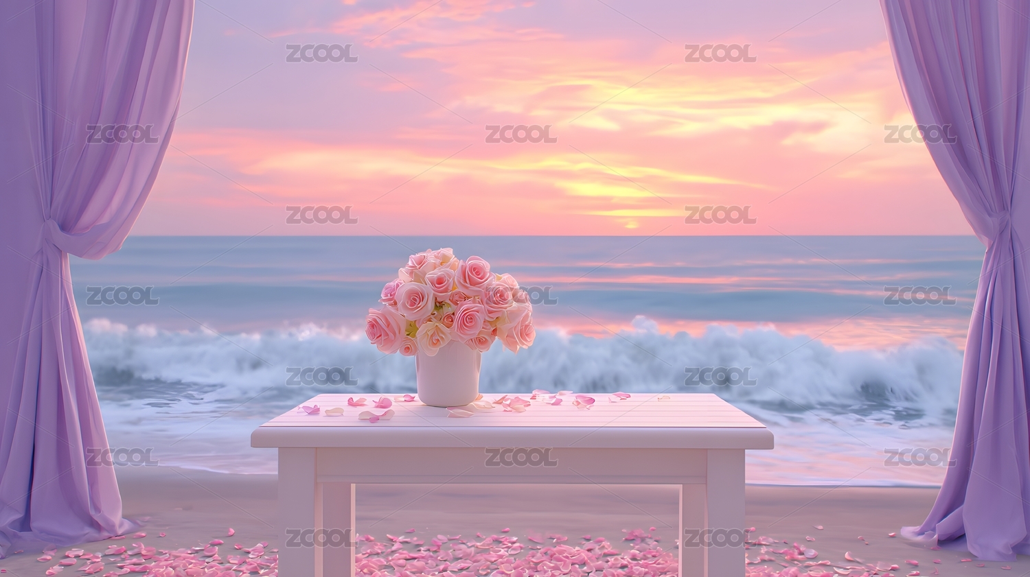 海边,海滩,花瓶,沙滩,海洋,天空,云彩,海浪,落日,鲜花