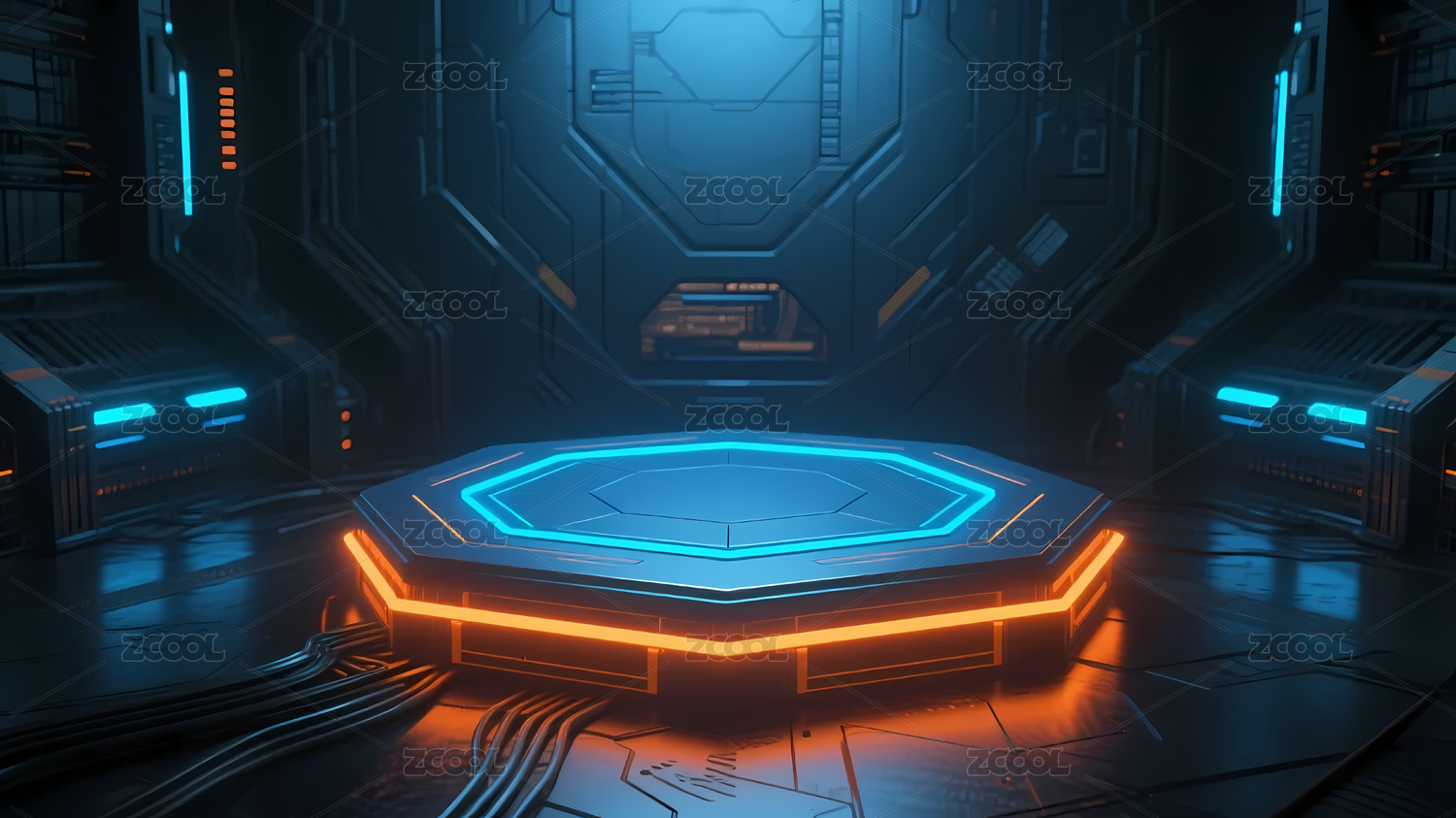 六边形发光平台的科幻墙面