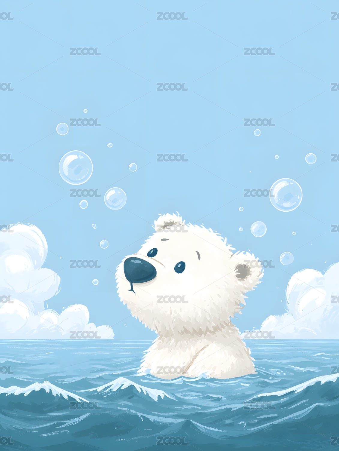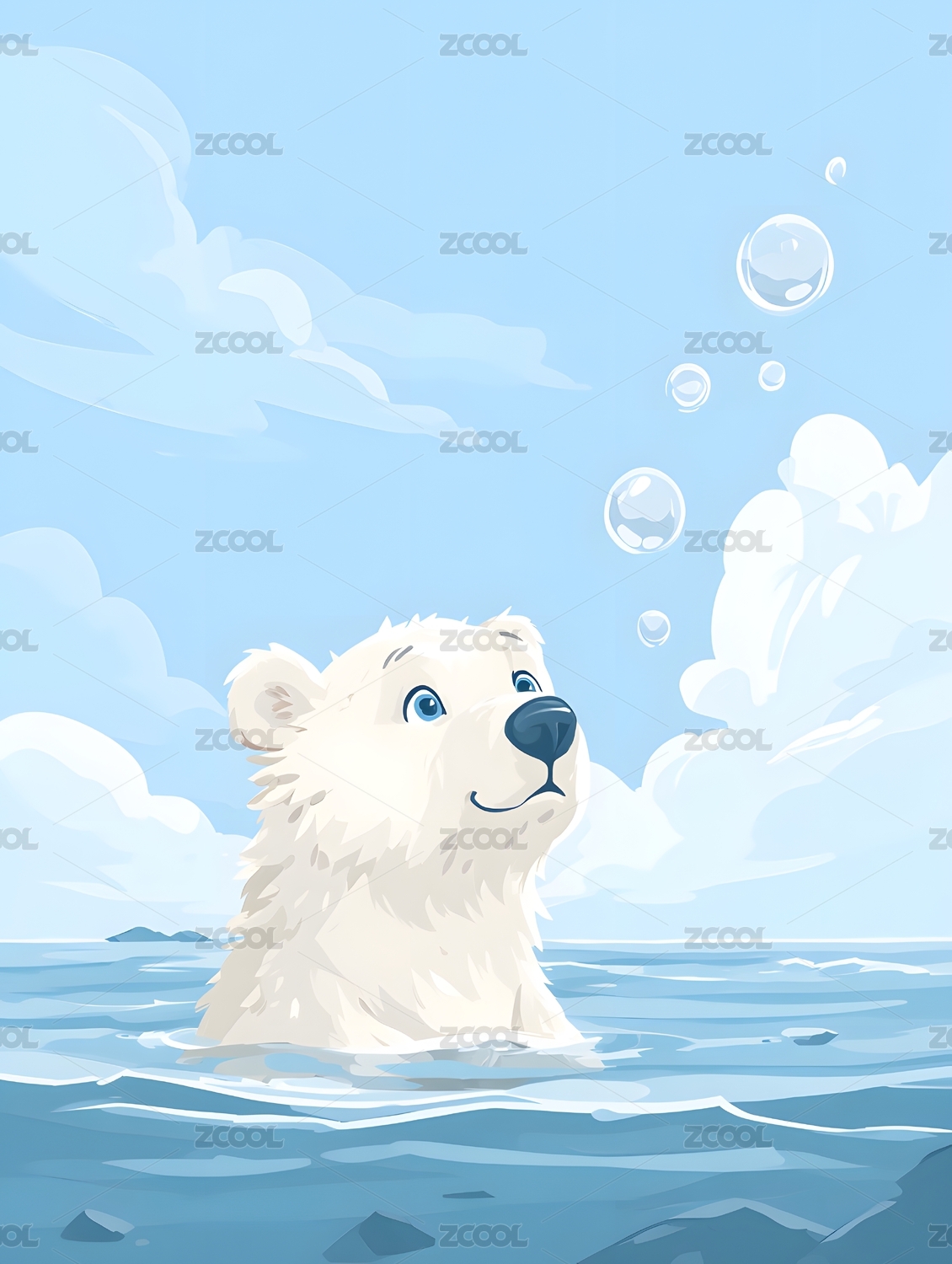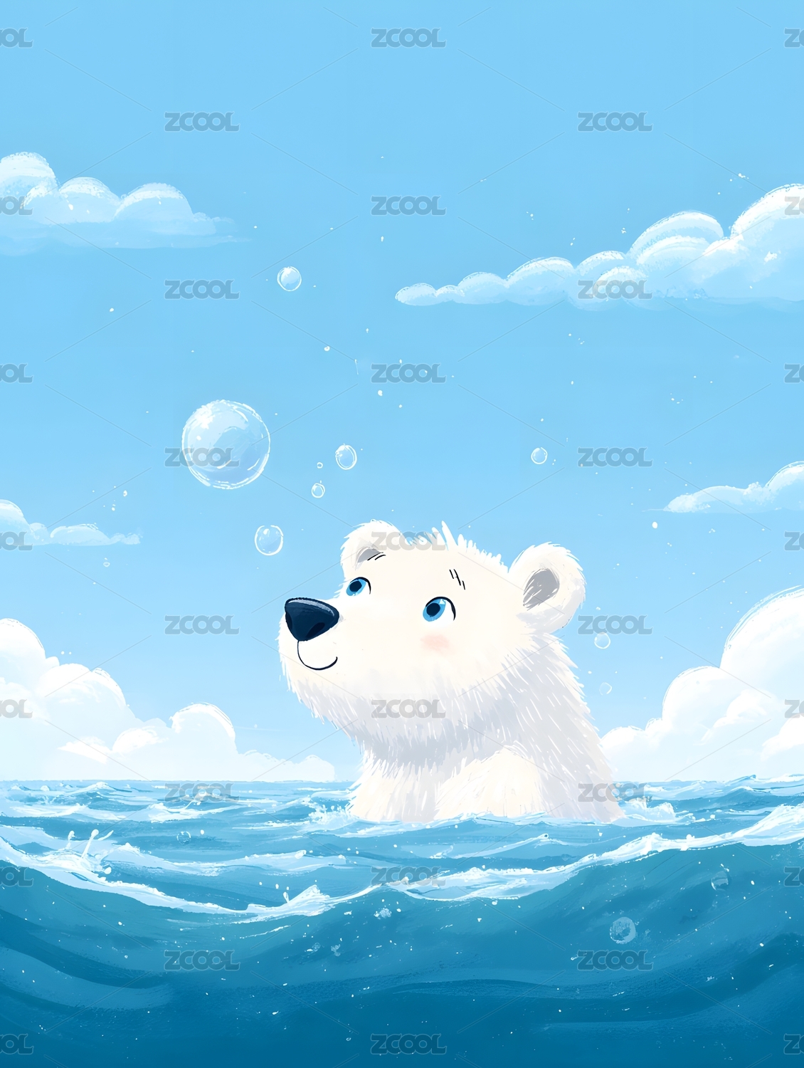 海边,蓝天,海洋,云朵,水波,水面,气泡,姿态,北极熊,眼神