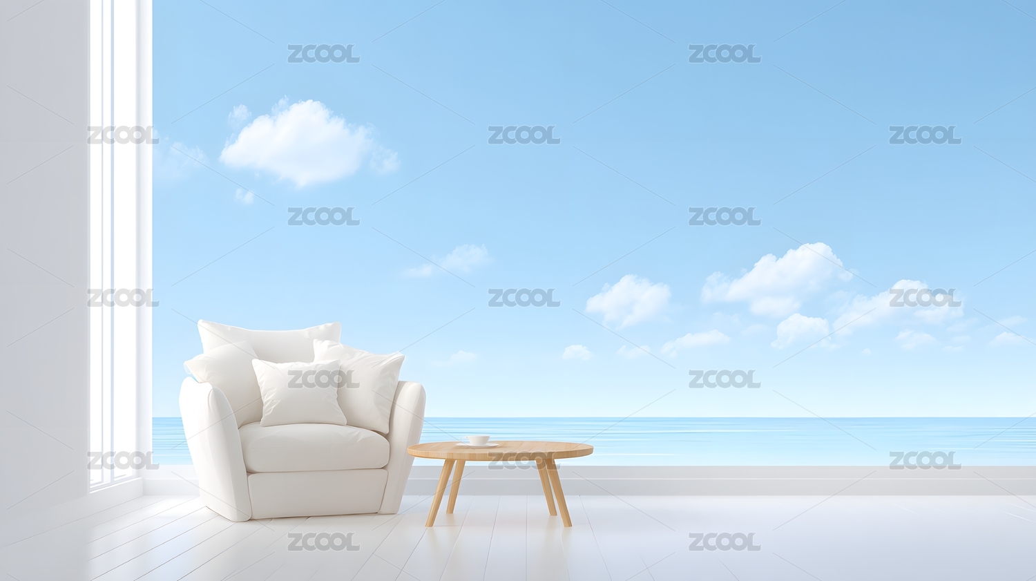 窗边沙发茶几与海景蓝天