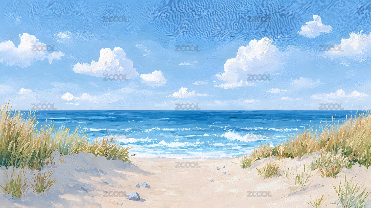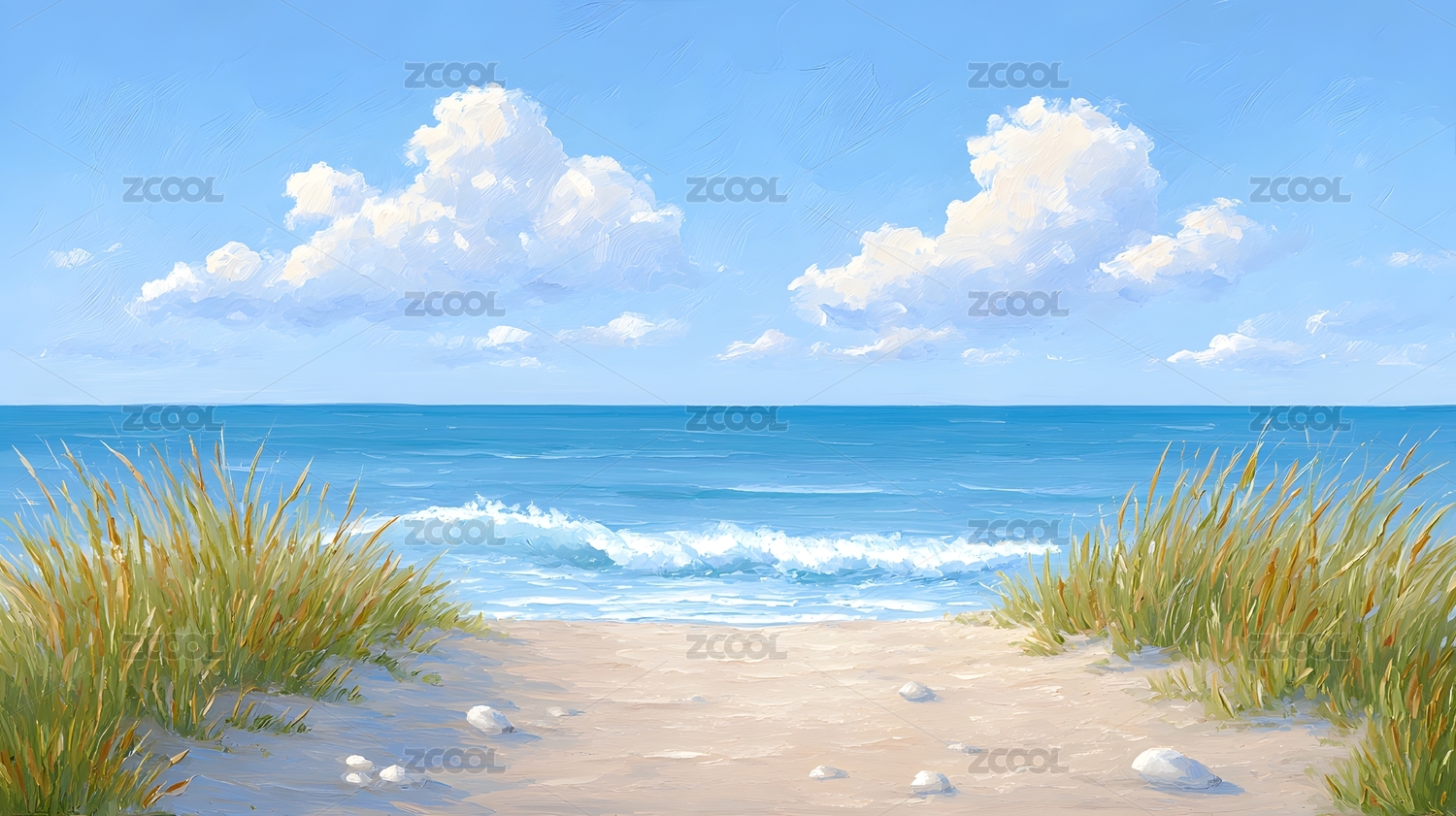 沙滩草海与蓝天白云美景