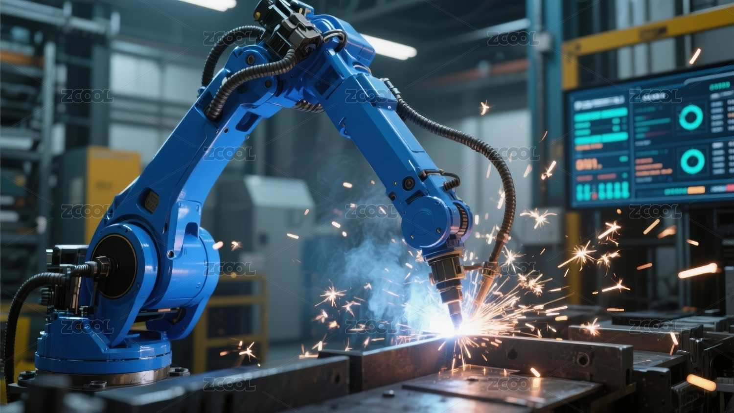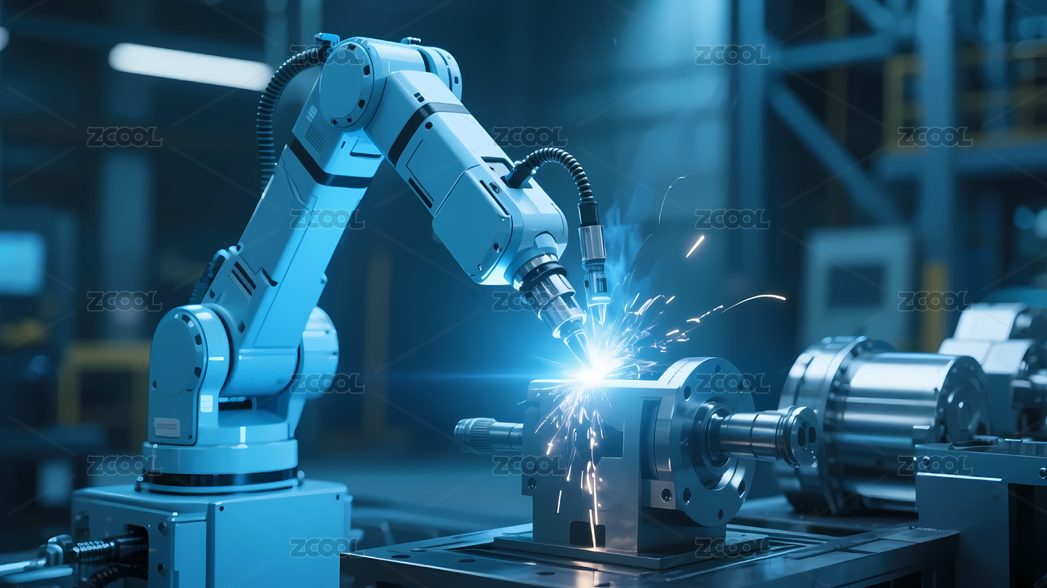 工业车间蓝色机械臂焊接