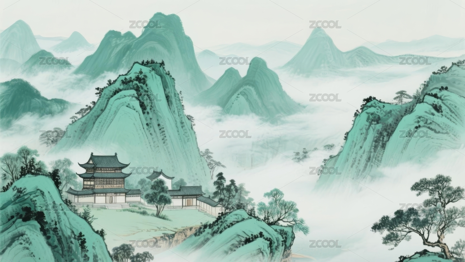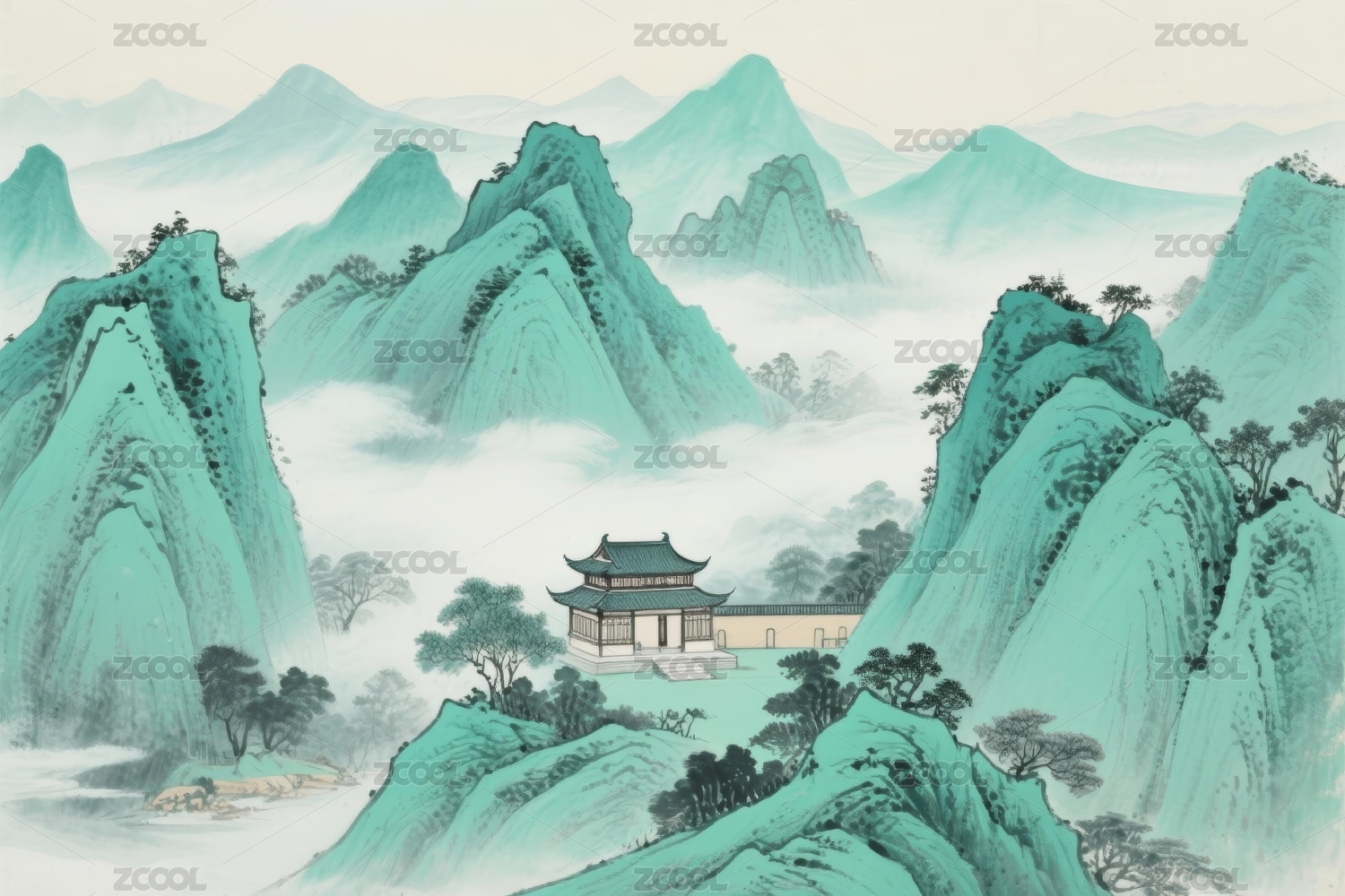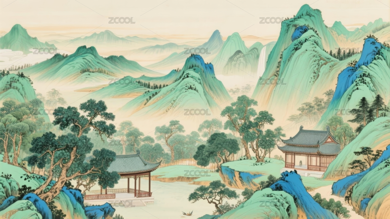 山水青绿古典园林场景
