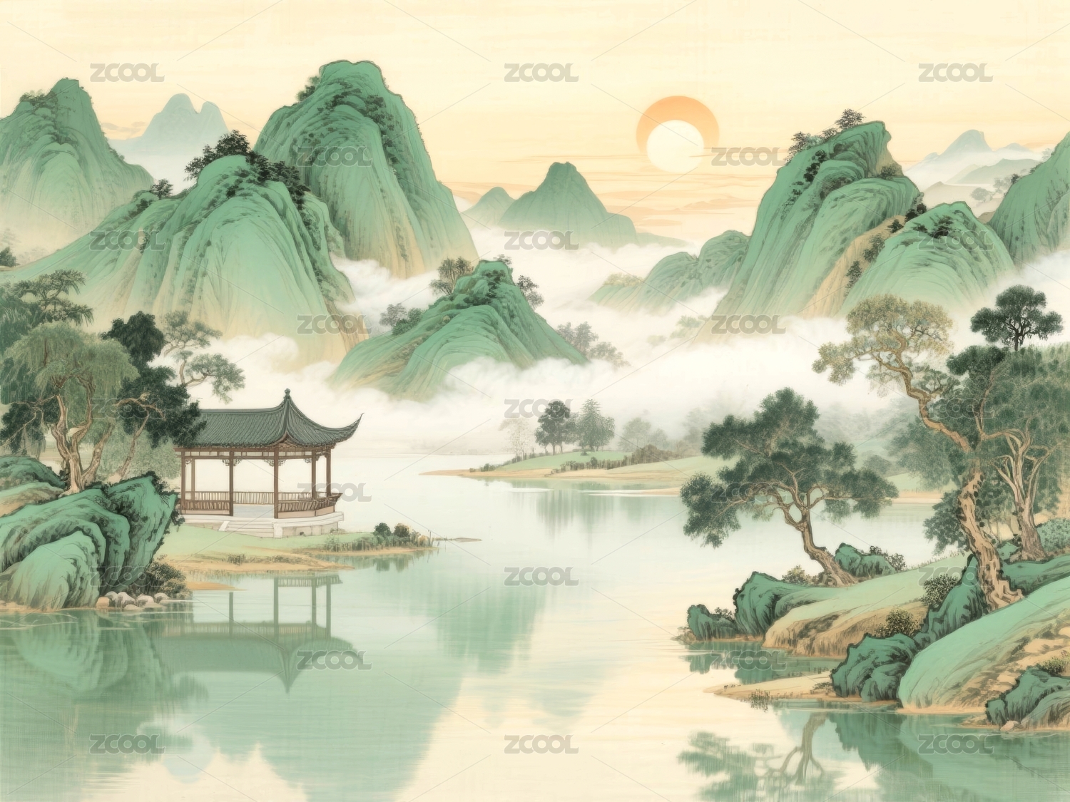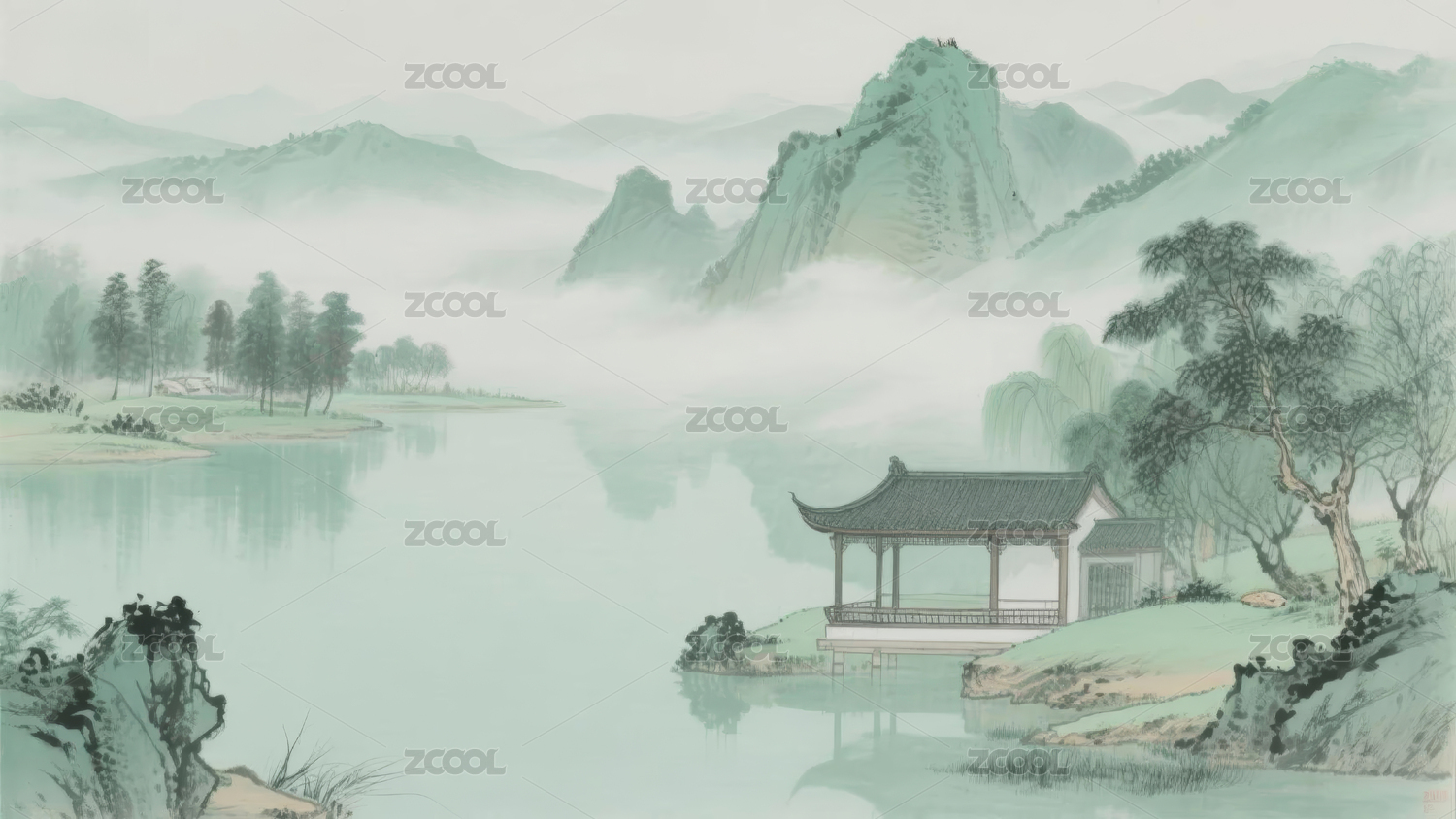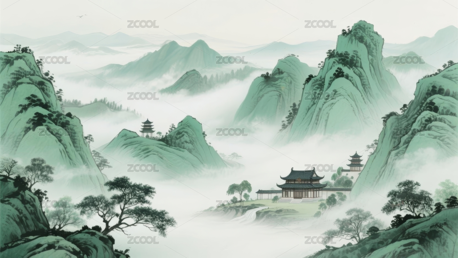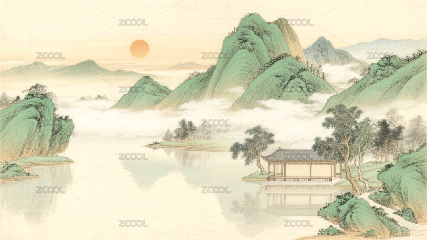 山水青绿古典园林场景