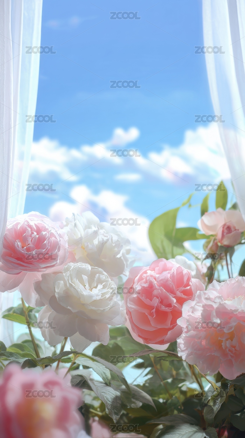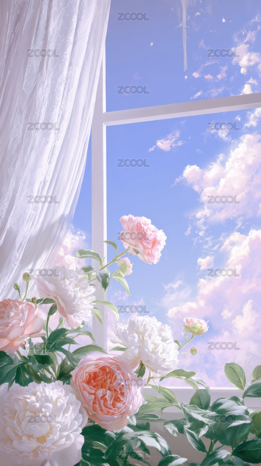 春天白天阳光下门窗外粉花绿色原野3D插画