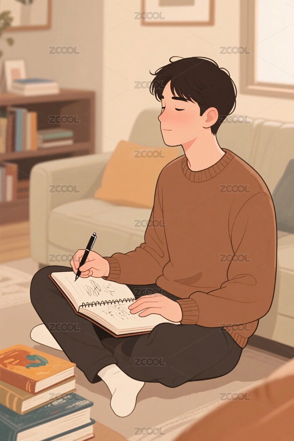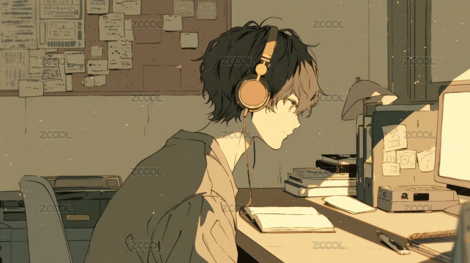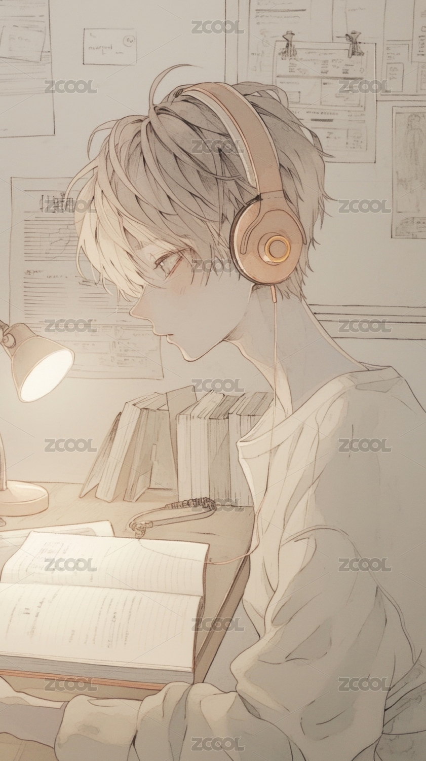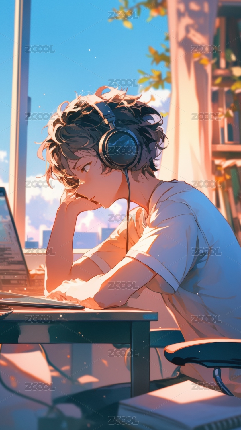 明亮图书馆书架前的亚洲男孩日漫绘画插画