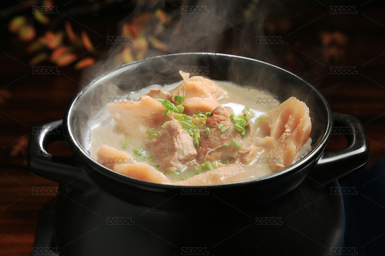 暗色背景上黑色砂锅里冒着热气的排骨藕汤