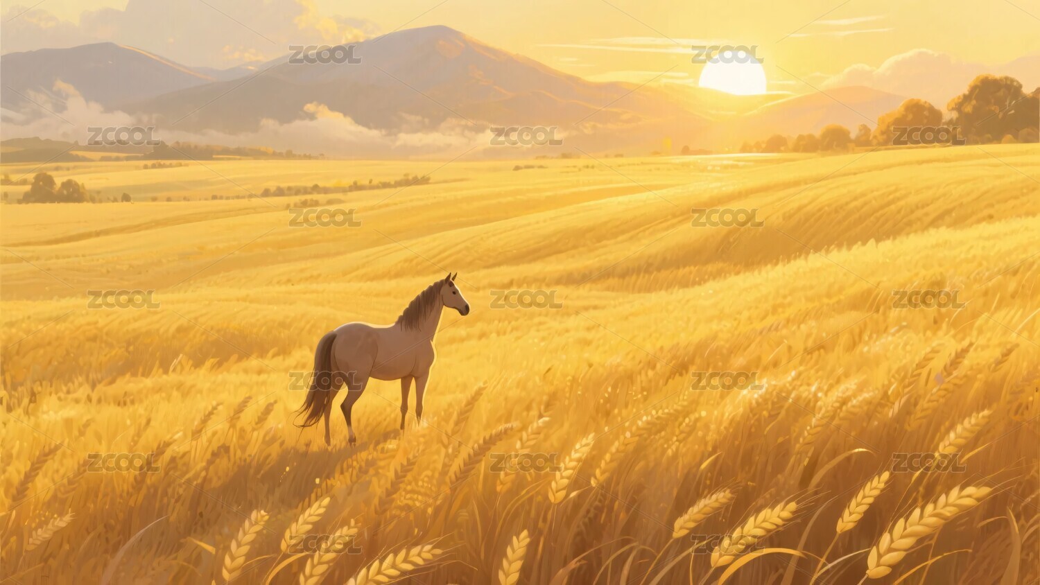 麦田中夕阳下的孤马