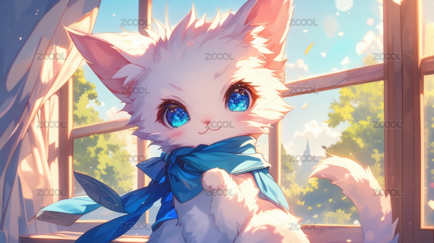 尾巴,拟人角色,蓝色眼睛,猫耳,木质地板,日式门窗,自然光线,惊讶表情,室内环境,温馨氛围