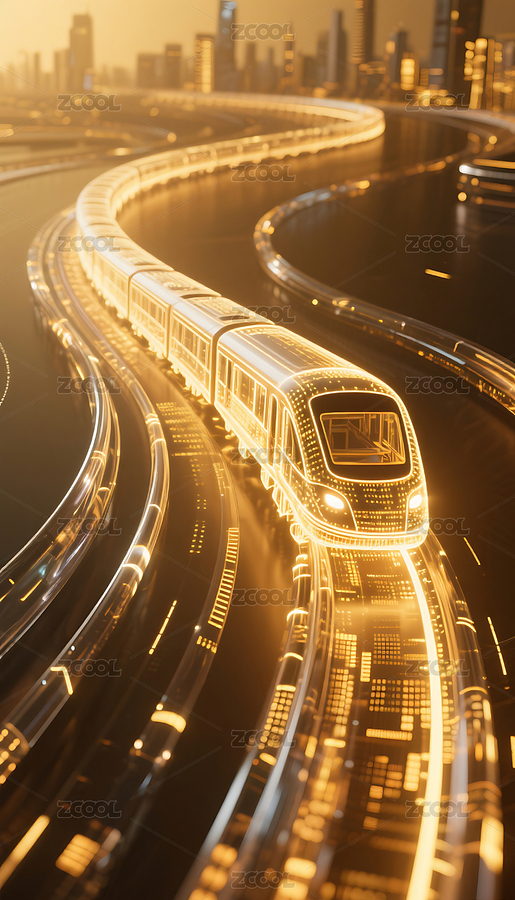 未来感高铁在夜晚的城市旁沿蜿蜒轨道疾驰