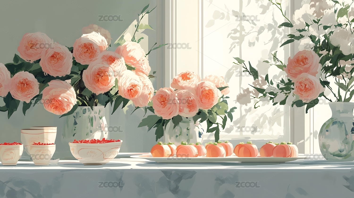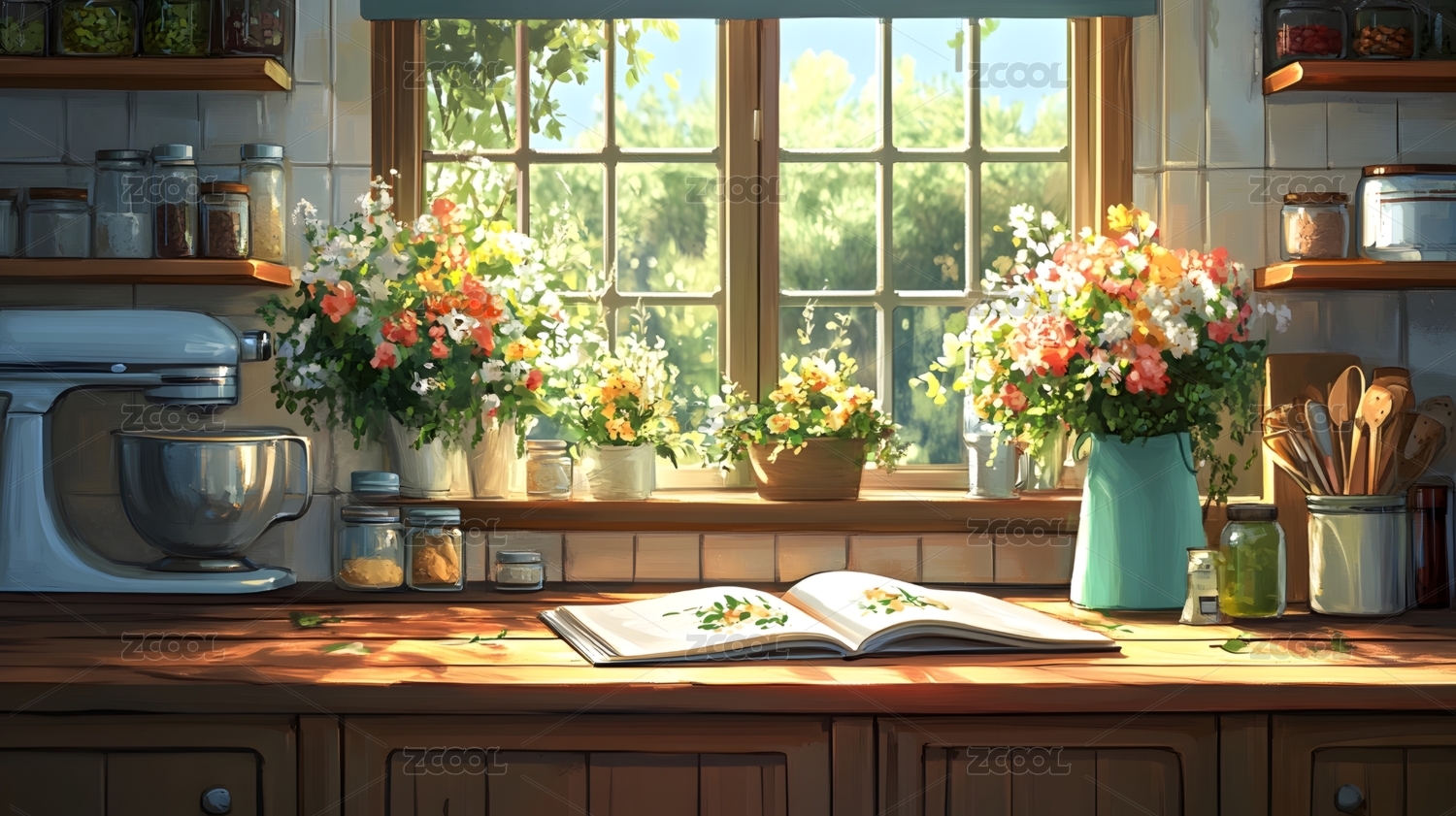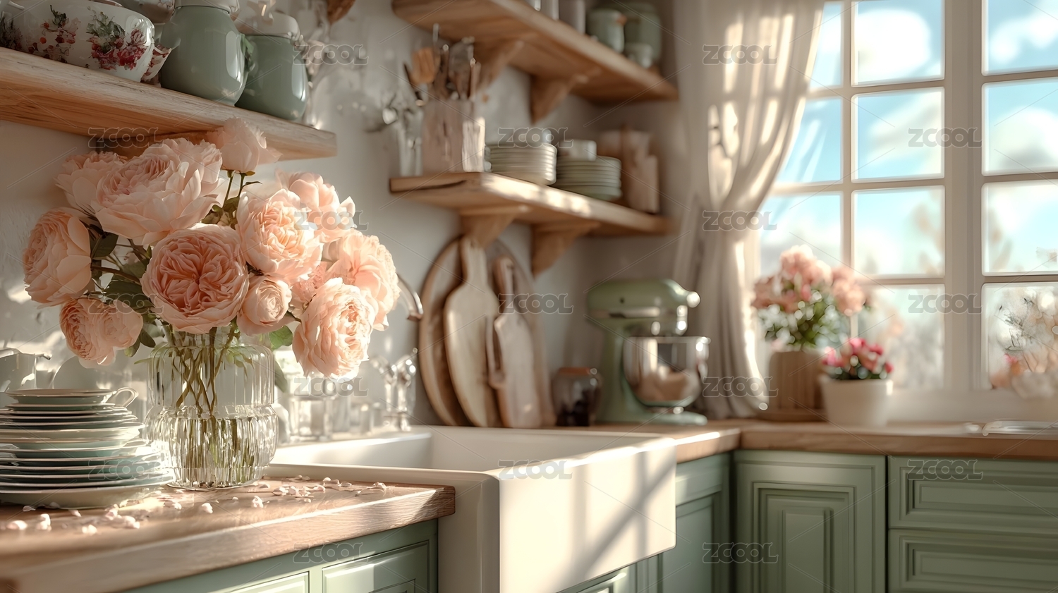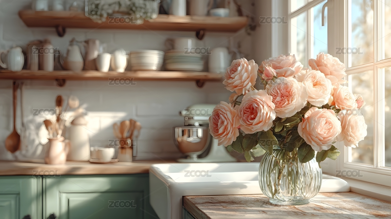 一束鲜艳的玫瑰花摆放在厨房桌上的花瓶中