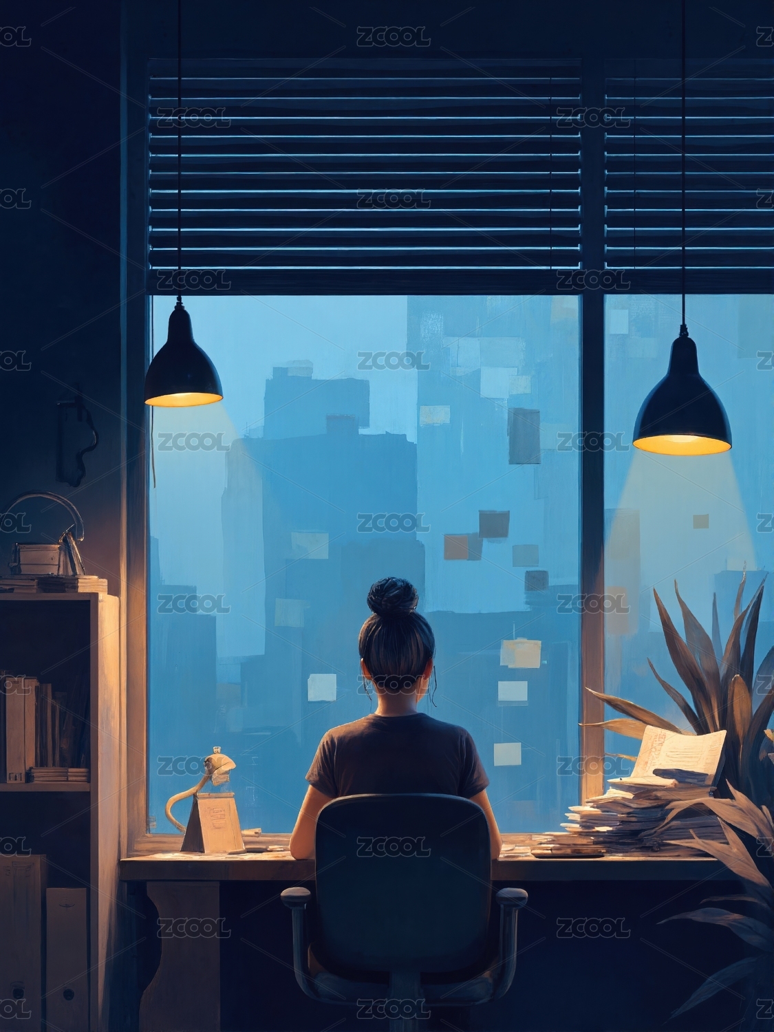 窗边凝望都市剪影的女子