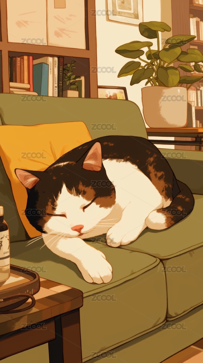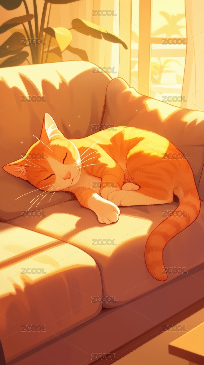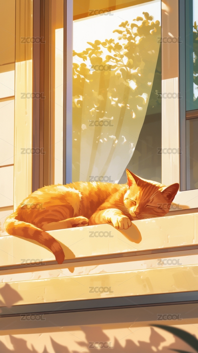 卡通,插画,宠物,室内,温馨,阳光,光线,猫咪,窗户,植物
