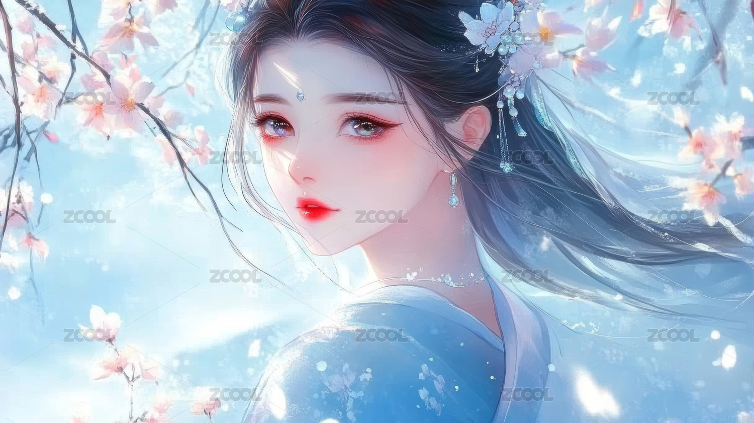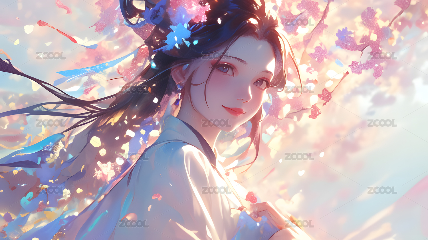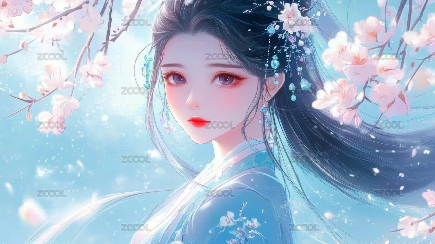 插画,梦幻,长发,艺术,背景,自然,户外,花瓣,蓝色,樱花