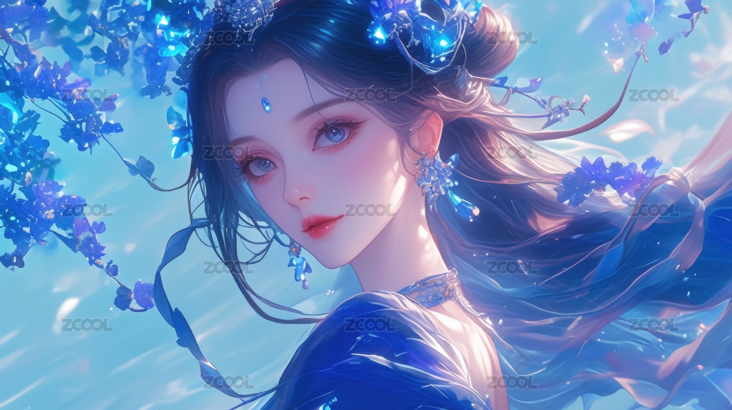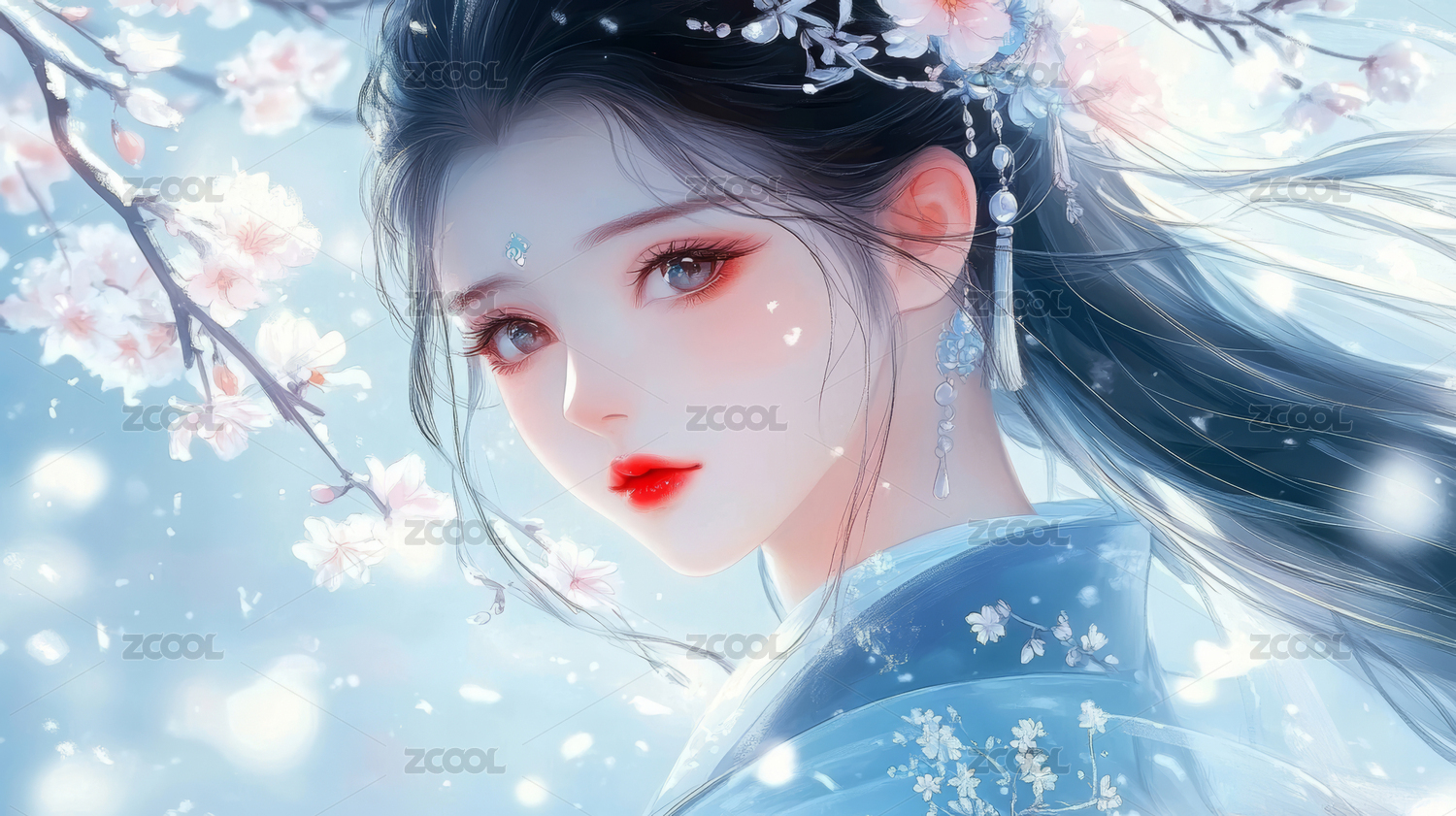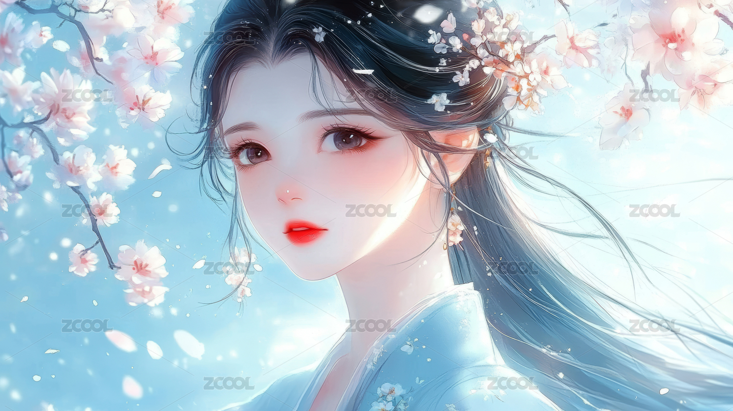 插画,梦幻,长发,艺术,背景,自然,户外,花瓣,蓝色,樱花