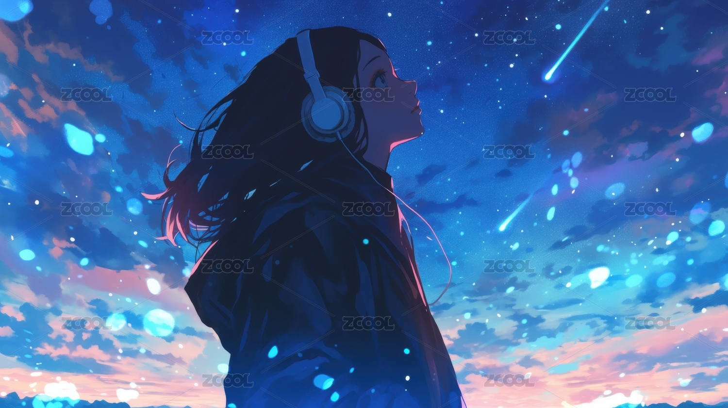 梦幻,耳机,窗户,室内,灯光,温馨,夜晚,蓝色,星空,静谧