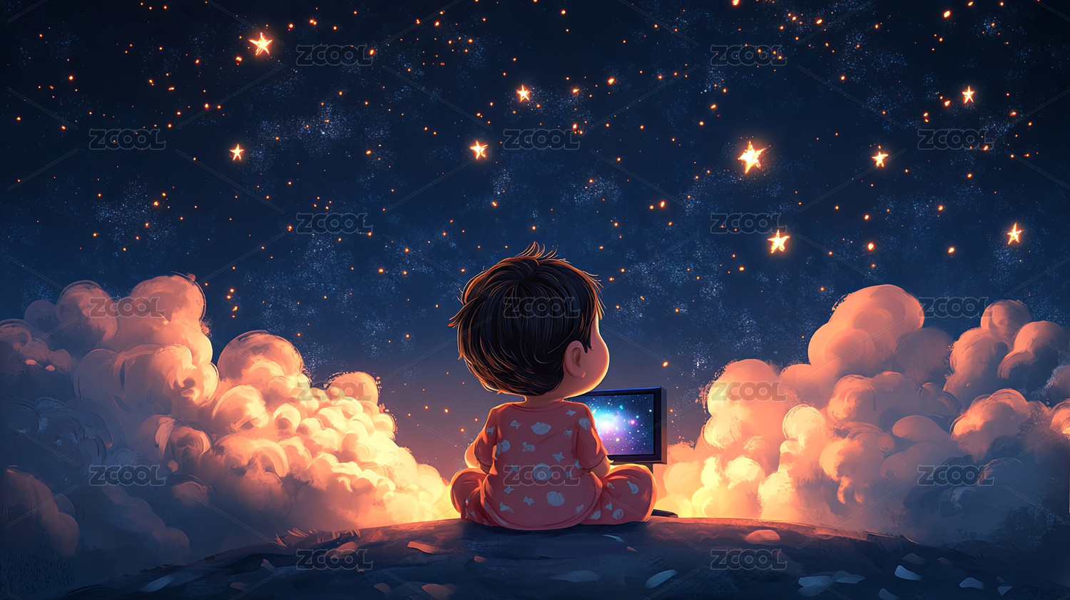 屋顶上坐着的孩子背影,看着夜空的月亮