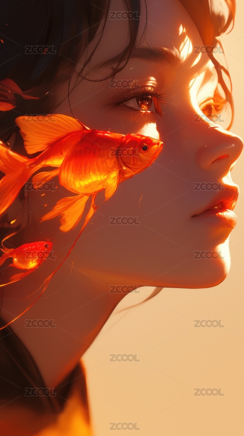 金鱼环绕的女子侧脸