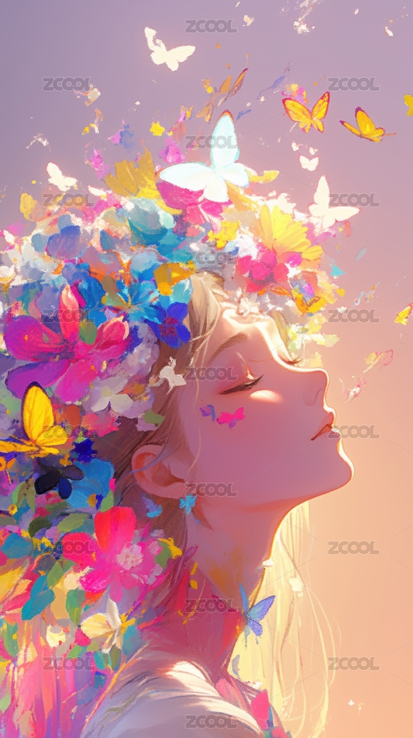 色彩斑斓的花朵与蝴蝶环绕少女