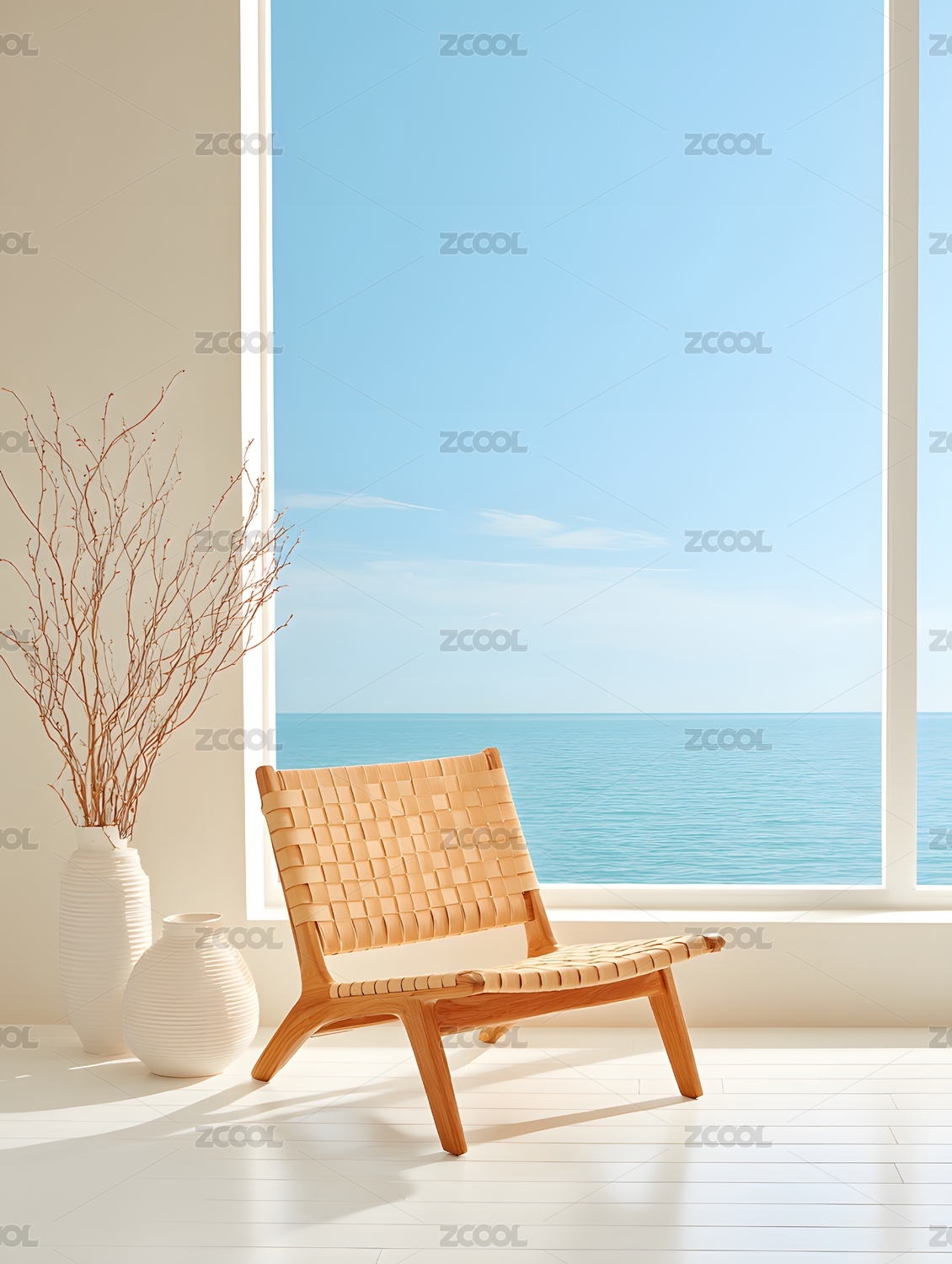 窗边藤椅海景静谧室内一角