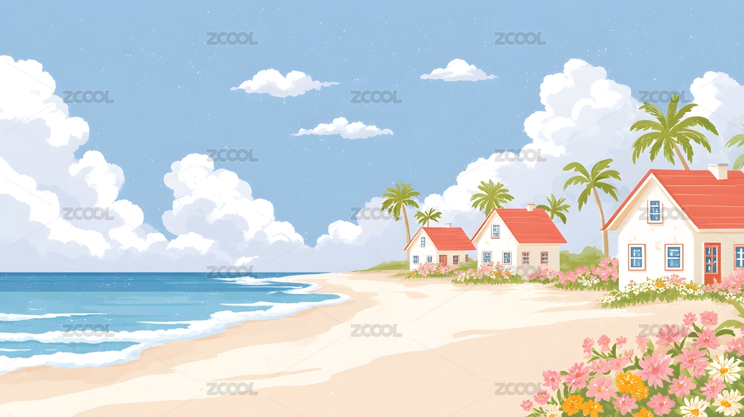海边小屋旁繁花盛开的沙滩