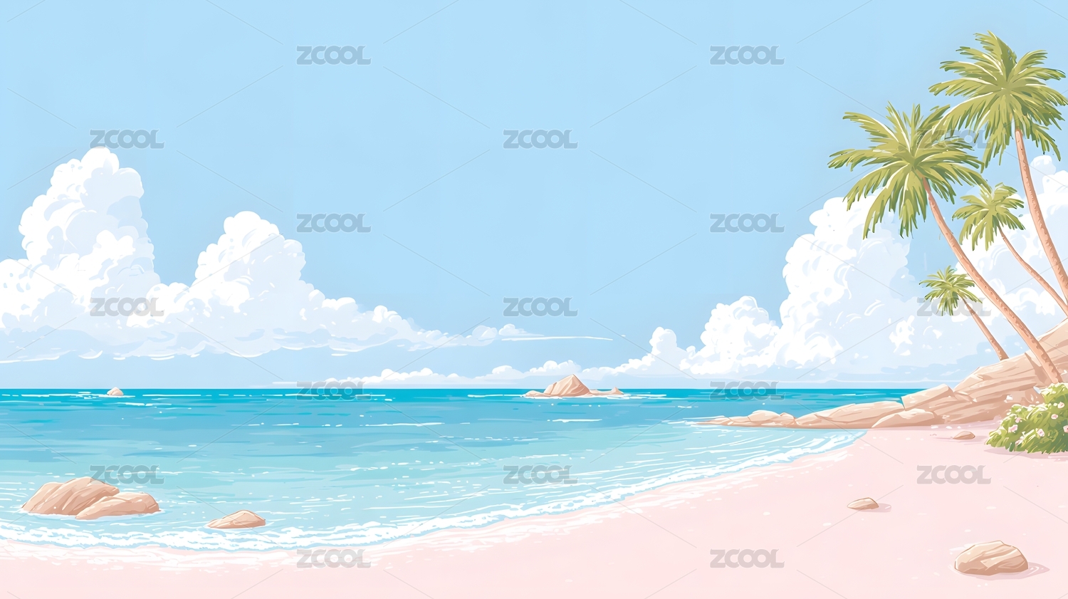 蓝天白云下的粉色沙滩与椰树