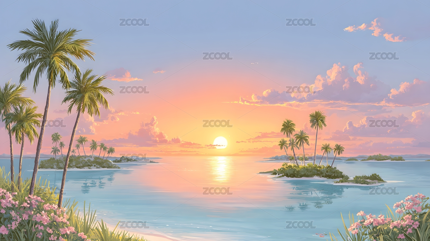 夕阳下海岛与椰树的梦幻海景