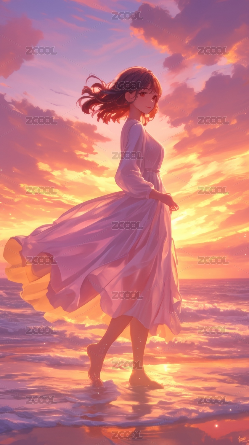 海边日落裙摆飞扬的少女
