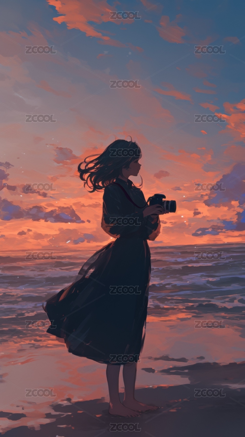 海边夕阳下的日漫美女插画