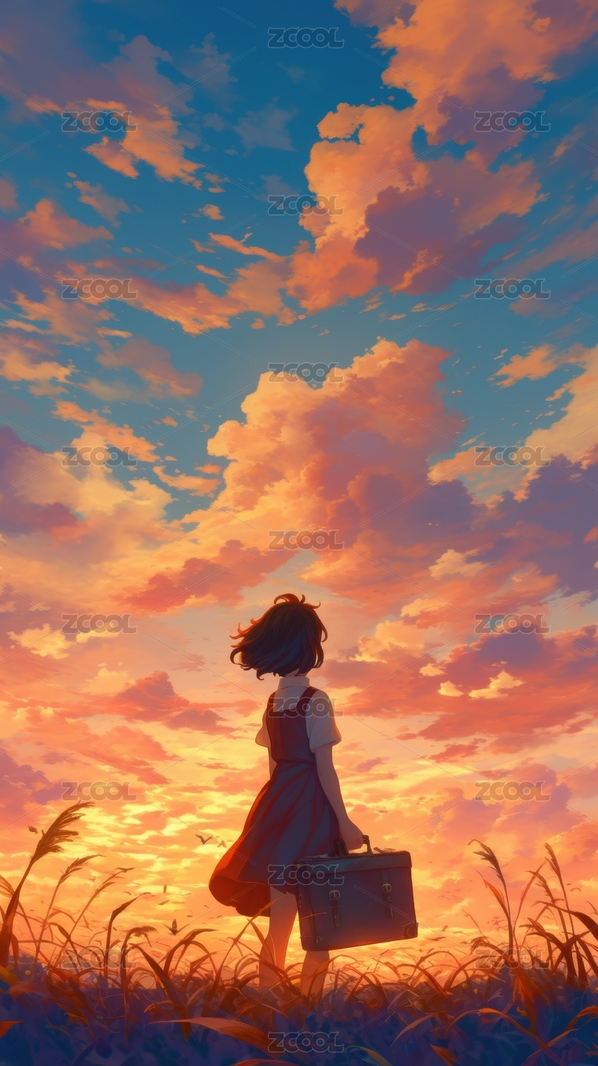 夕阳下提箱女孩的田野漫步