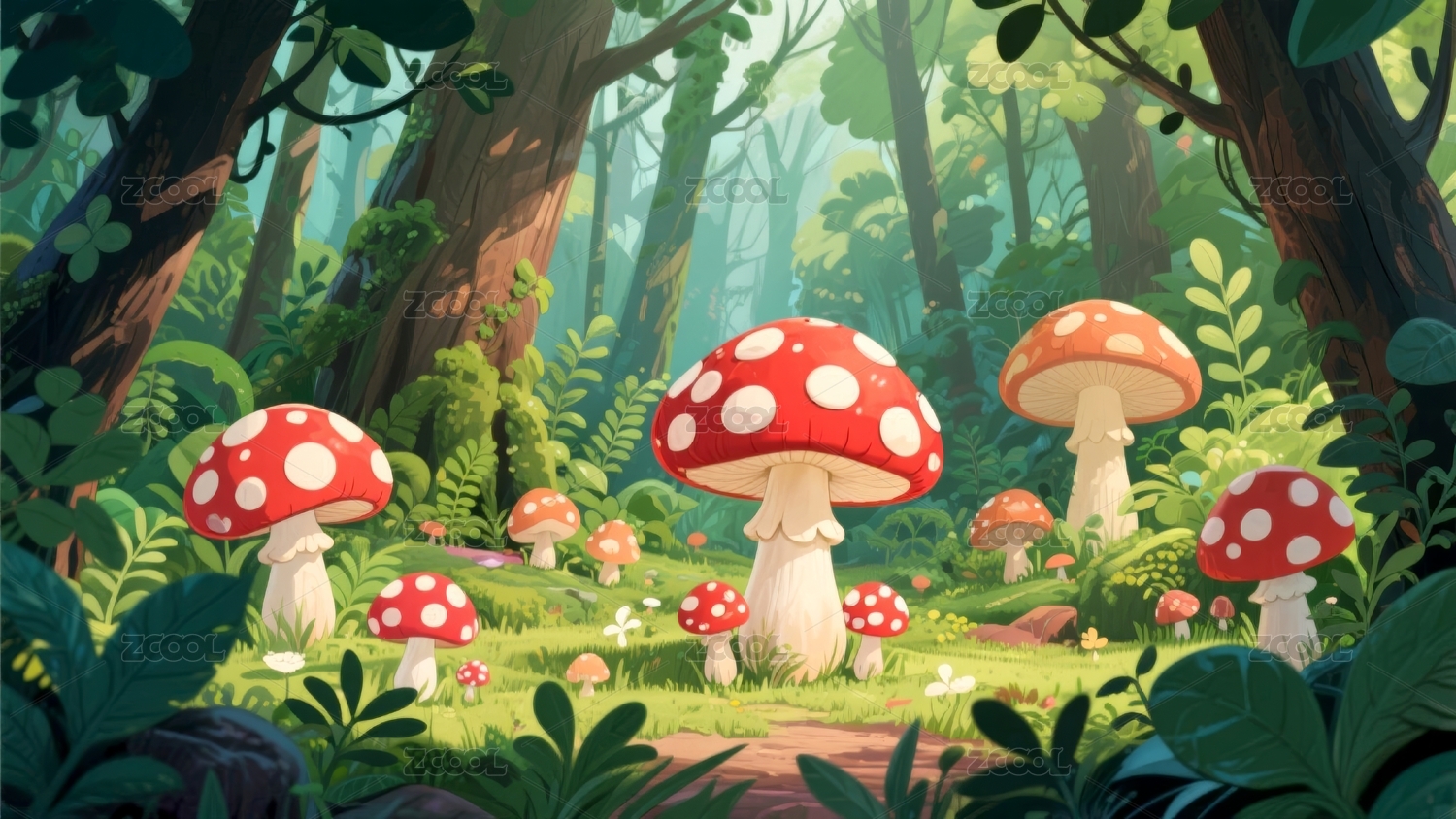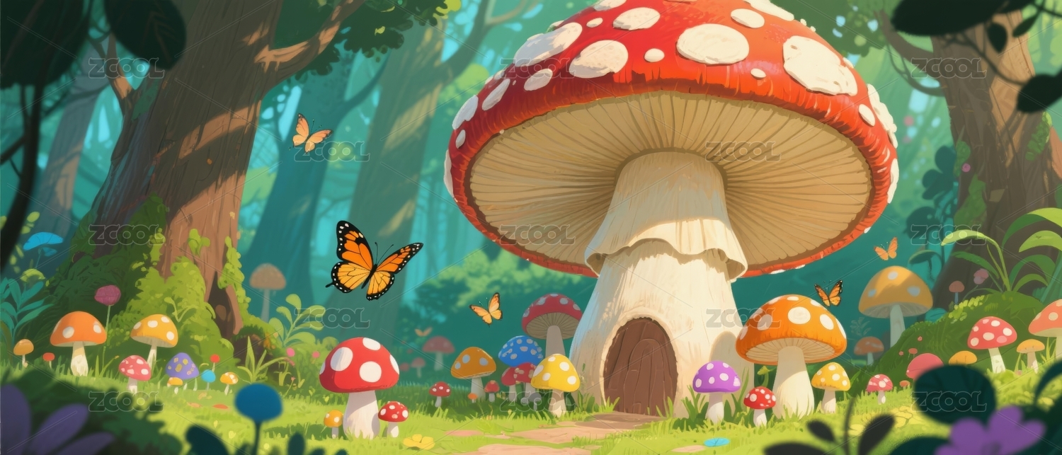 主视觉,场景,画面,背景,元素,森林,蘑菇,卡通,童话,蝴蝶