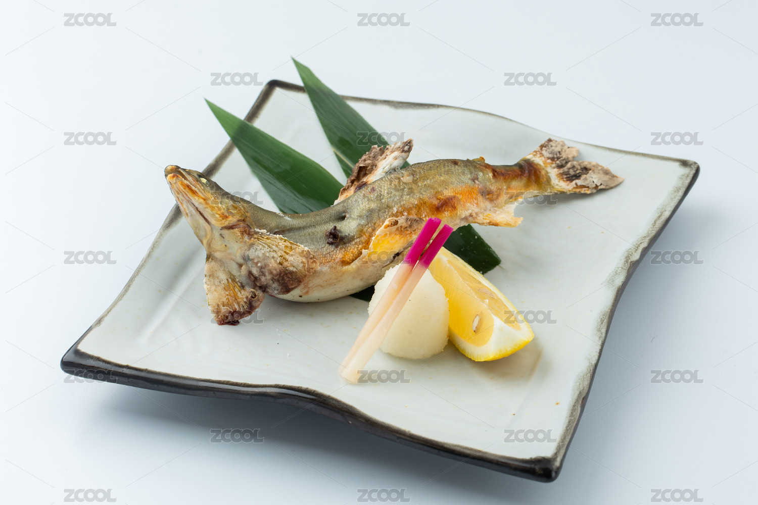 盛放在瓷盘内的日式烤鱼