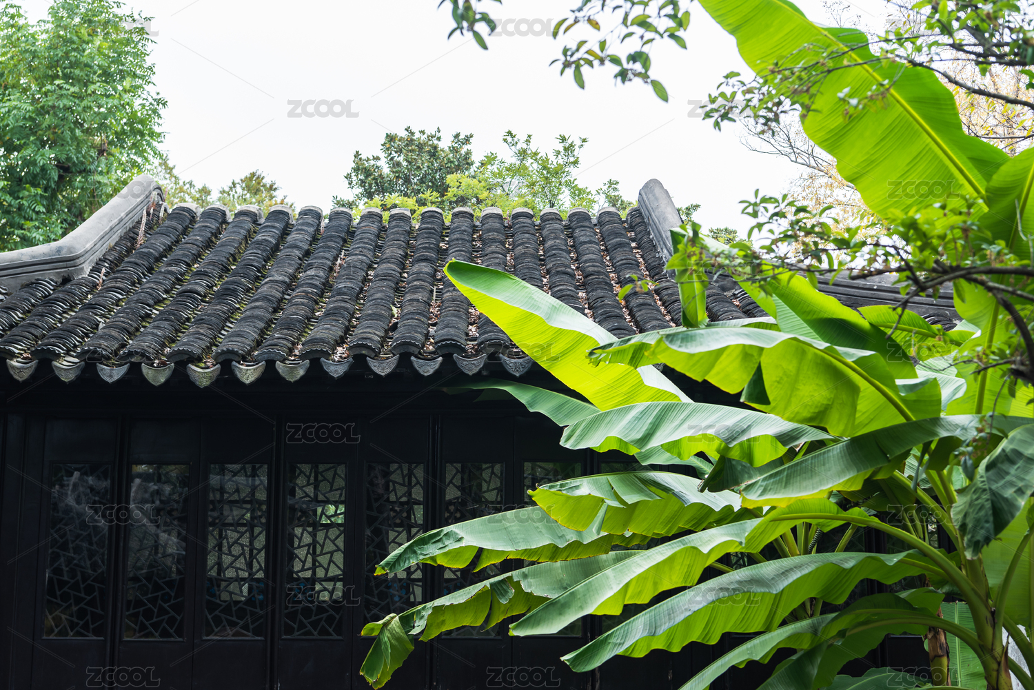 春天中国江南园林的古建筑与绿树