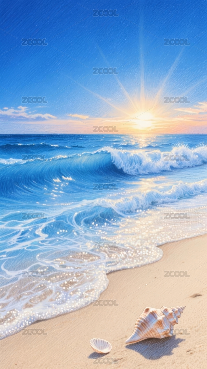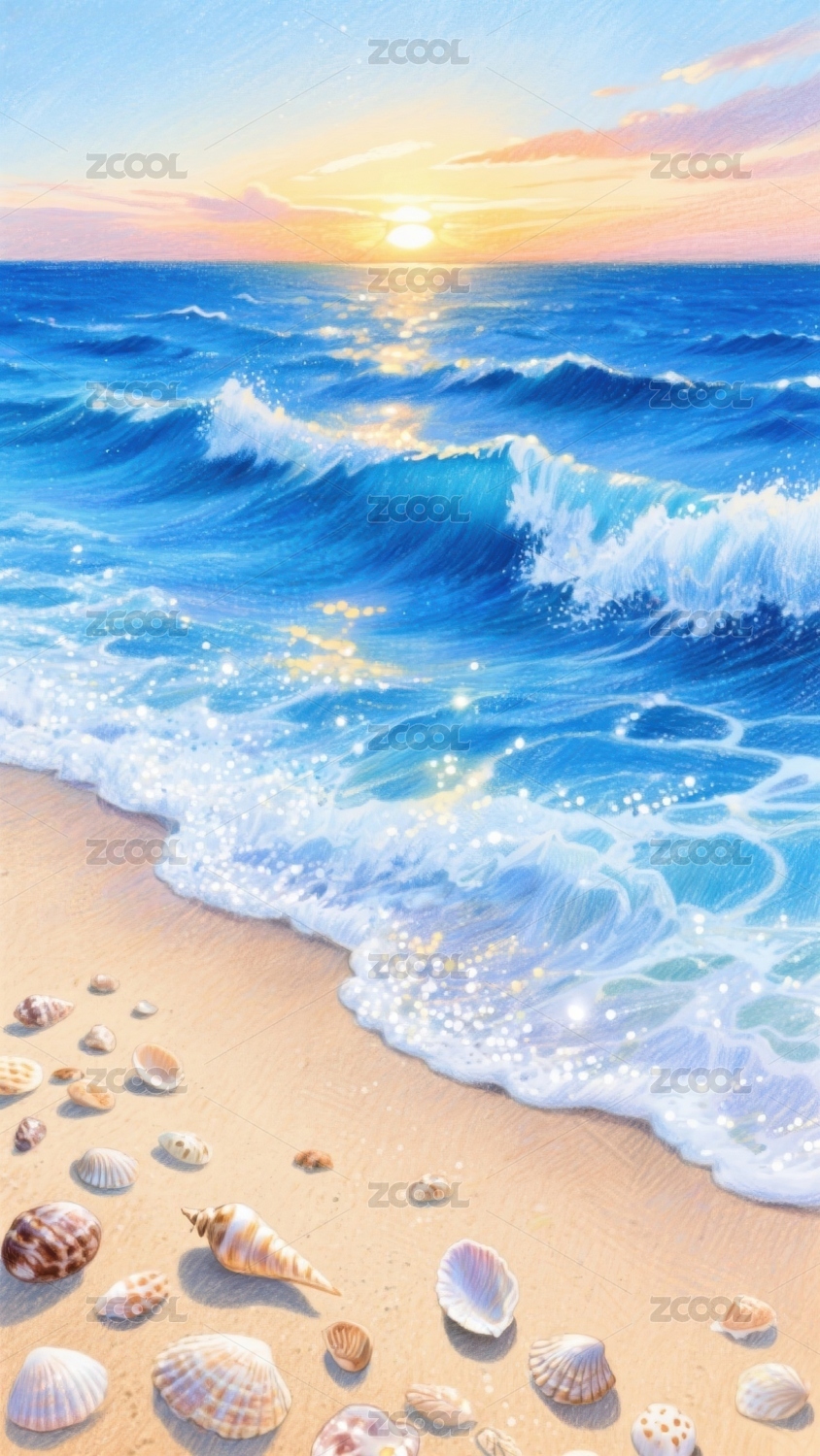 场景,商业,海滩,暖色调,海景,海浪,贝壳,沙滩,夕阳,海洋