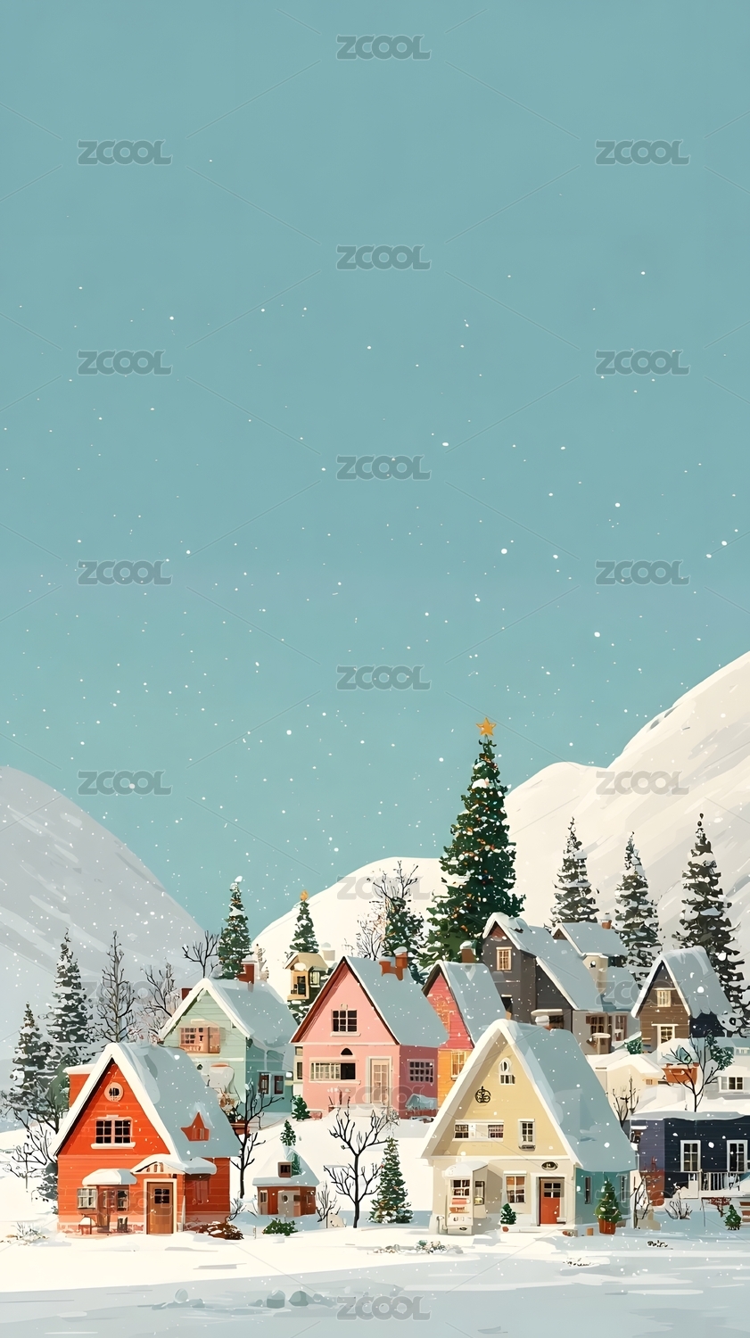 雪地中的彩色小屋与蓝天