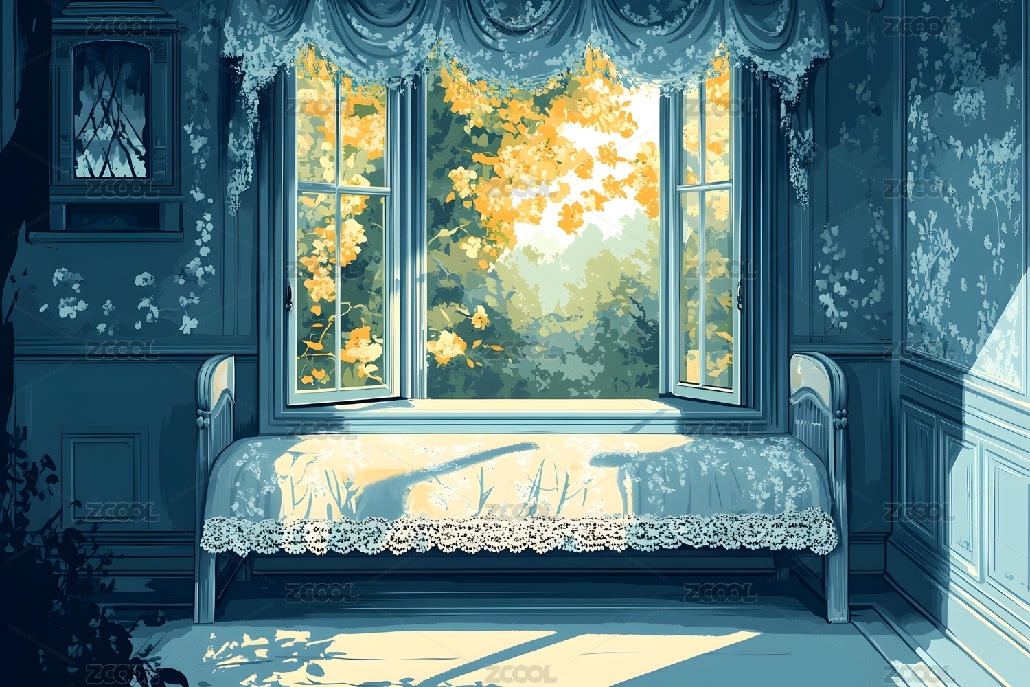 夏天白天阳光明亮的门窗外绿色原野3D插画