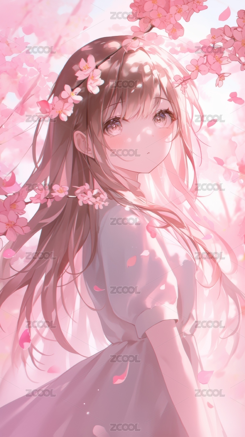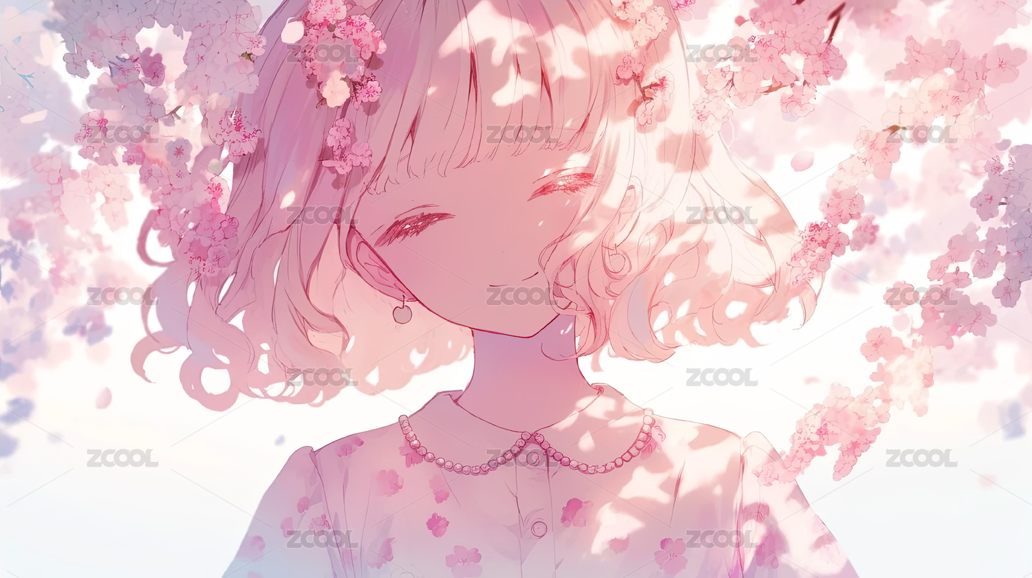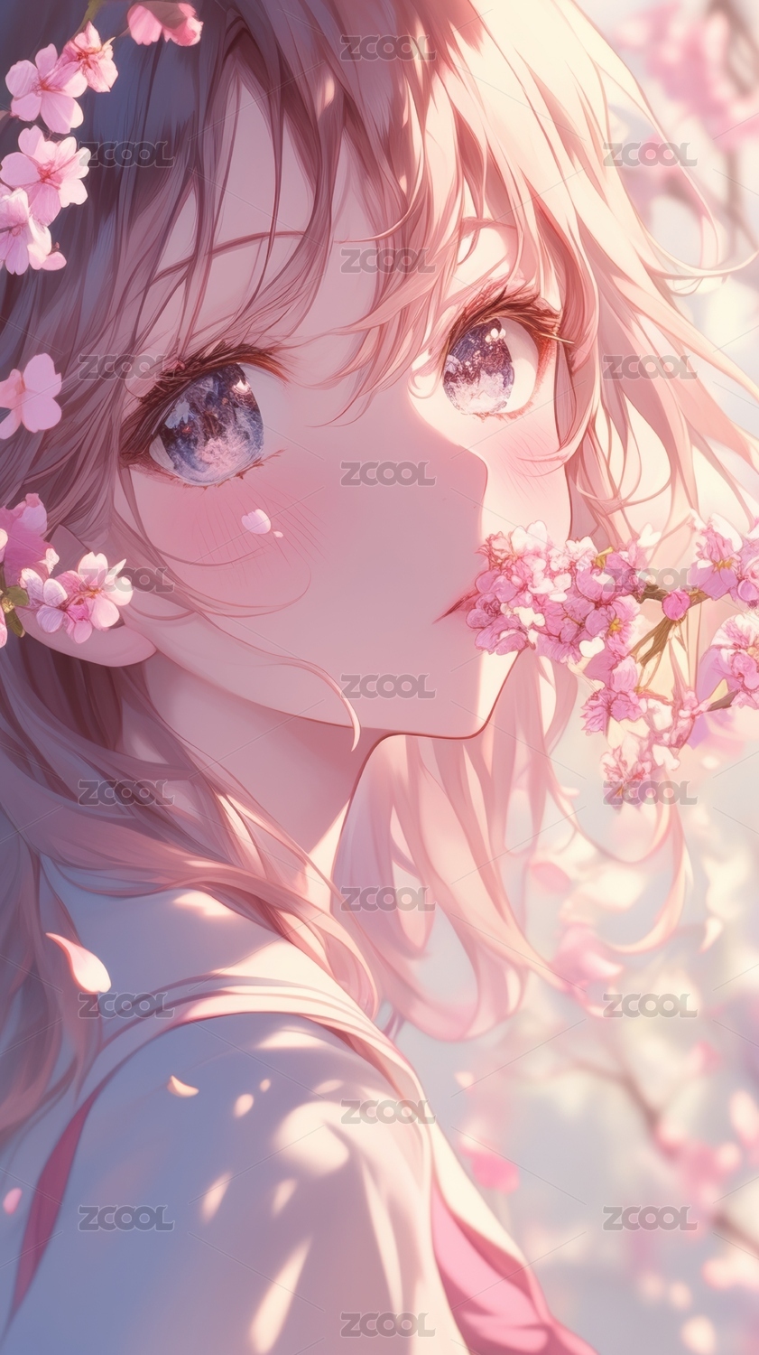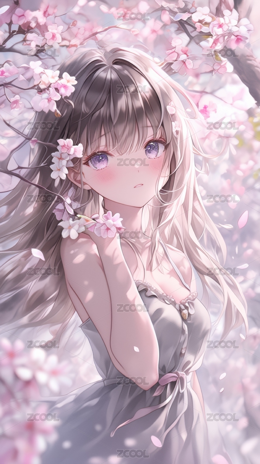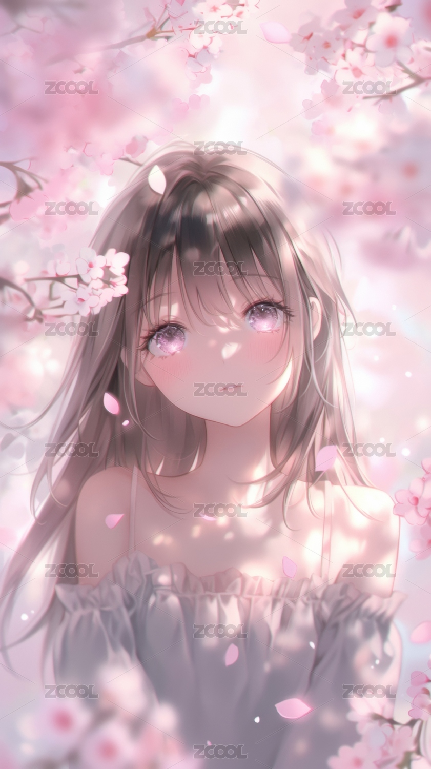 樱花树下的粉色长发少女