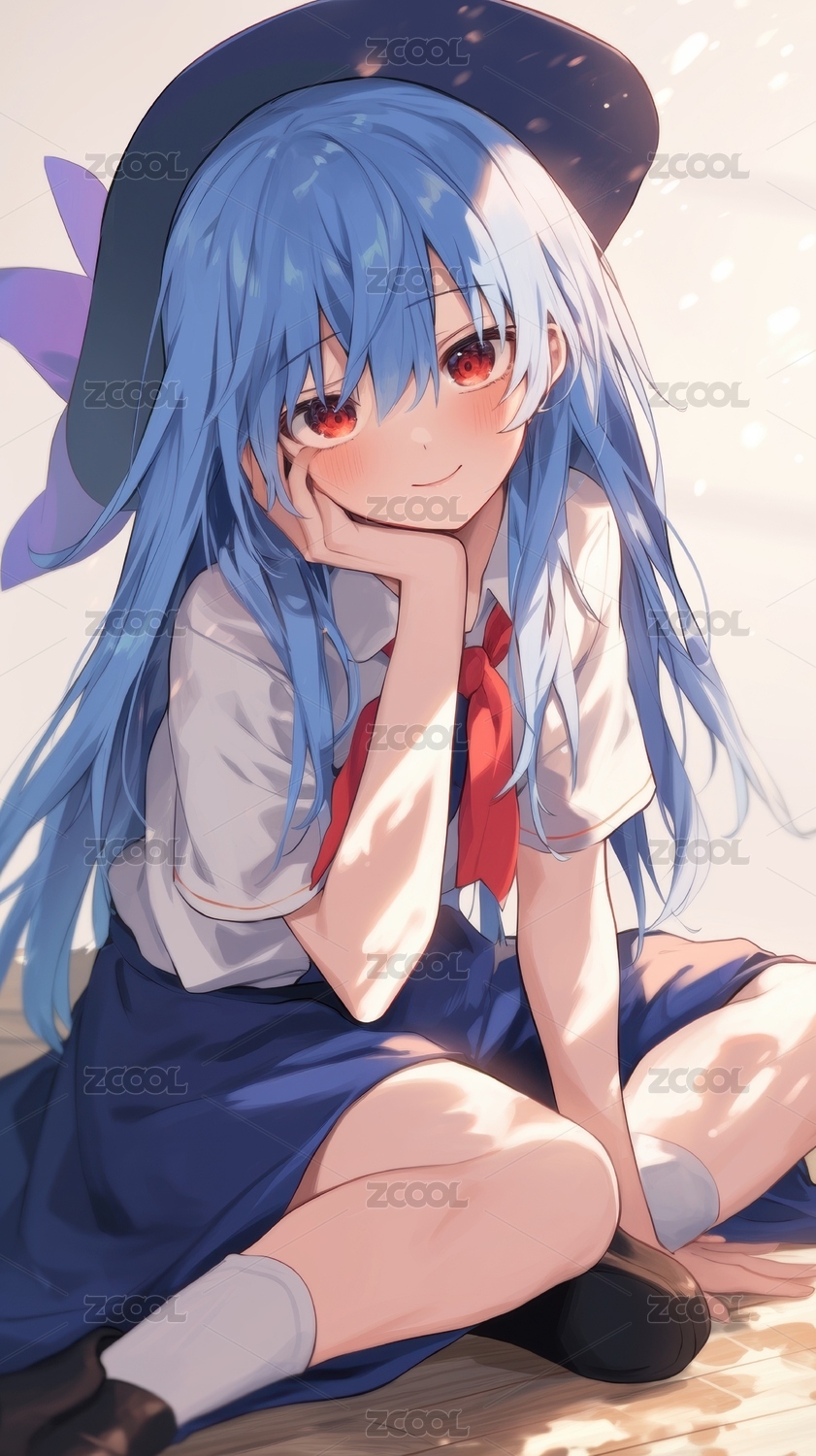 蓝发少女坐在地上头戴黑色帽子