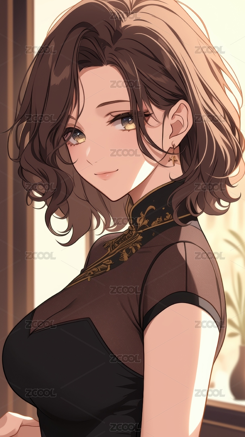 动漫,旗袍,女孩,优雅,花纹,盘发,传统,古典,东方,风韵