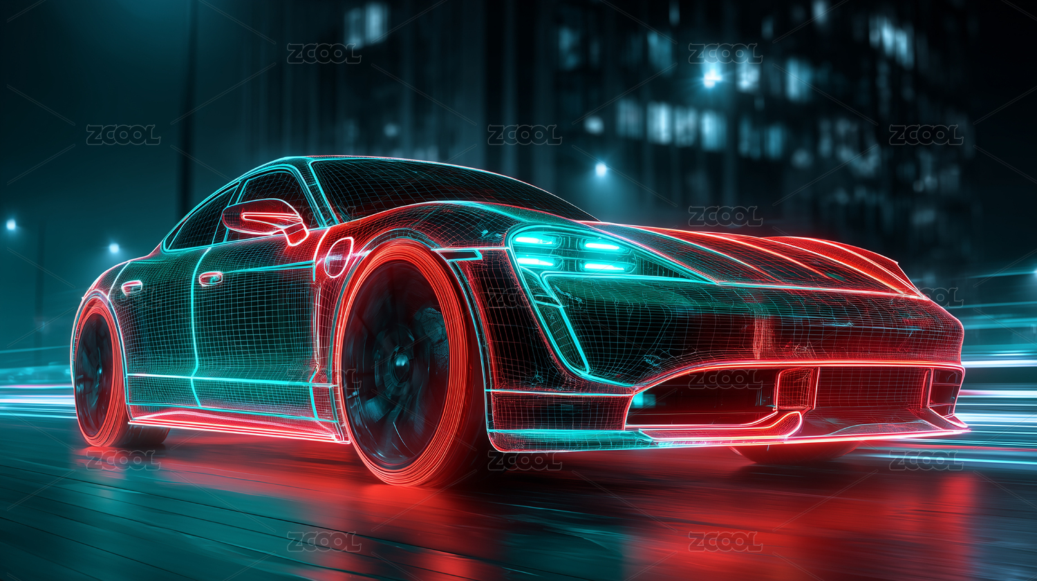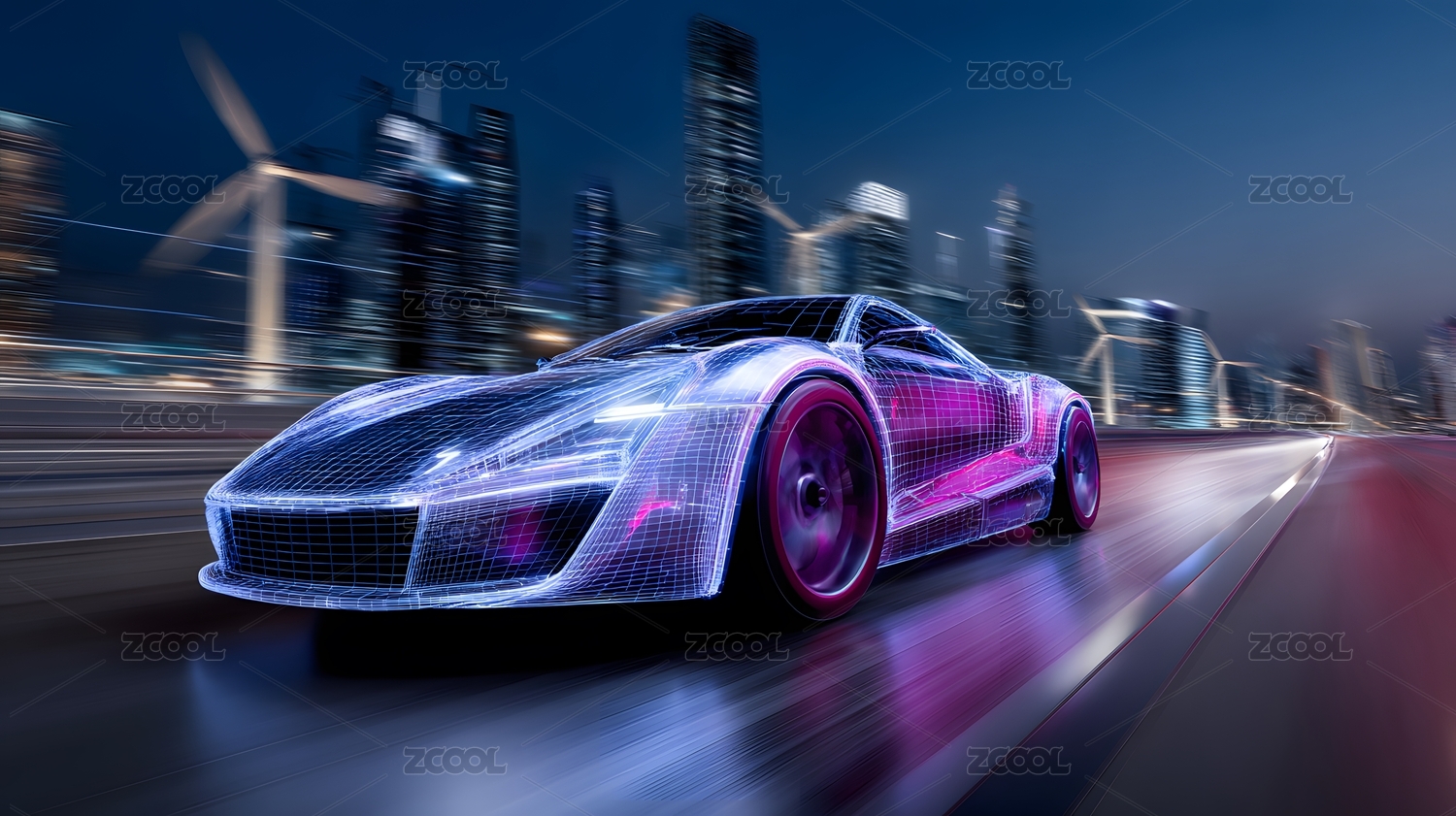 蓝色网格跑车穿梭未来都市夜景