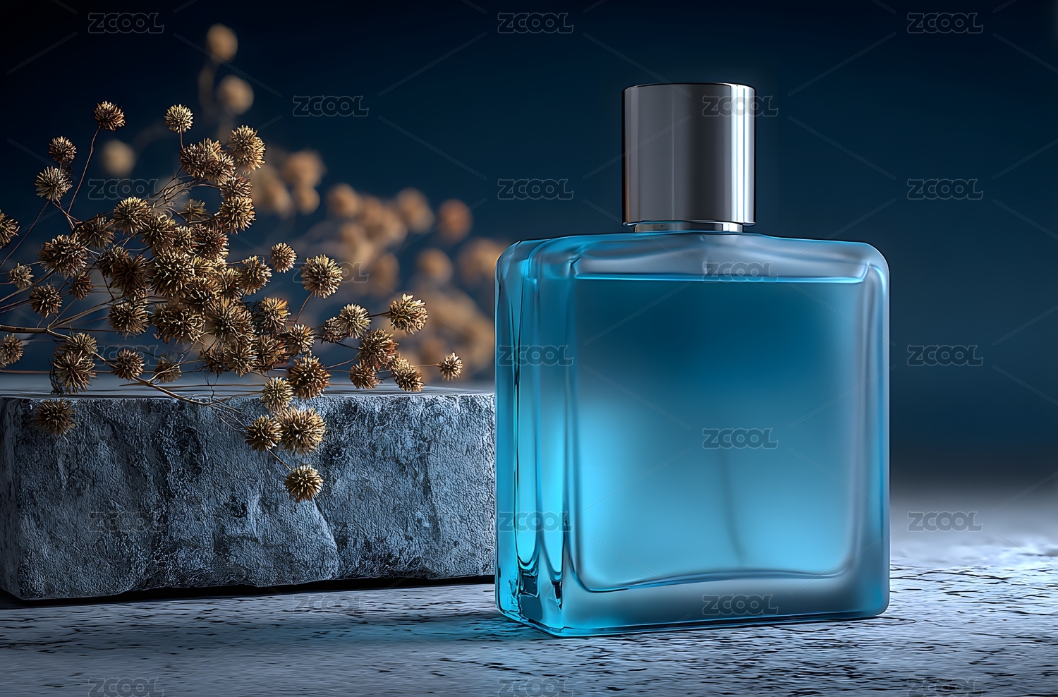 蓝色香水瓶与干花摆设静物氛围