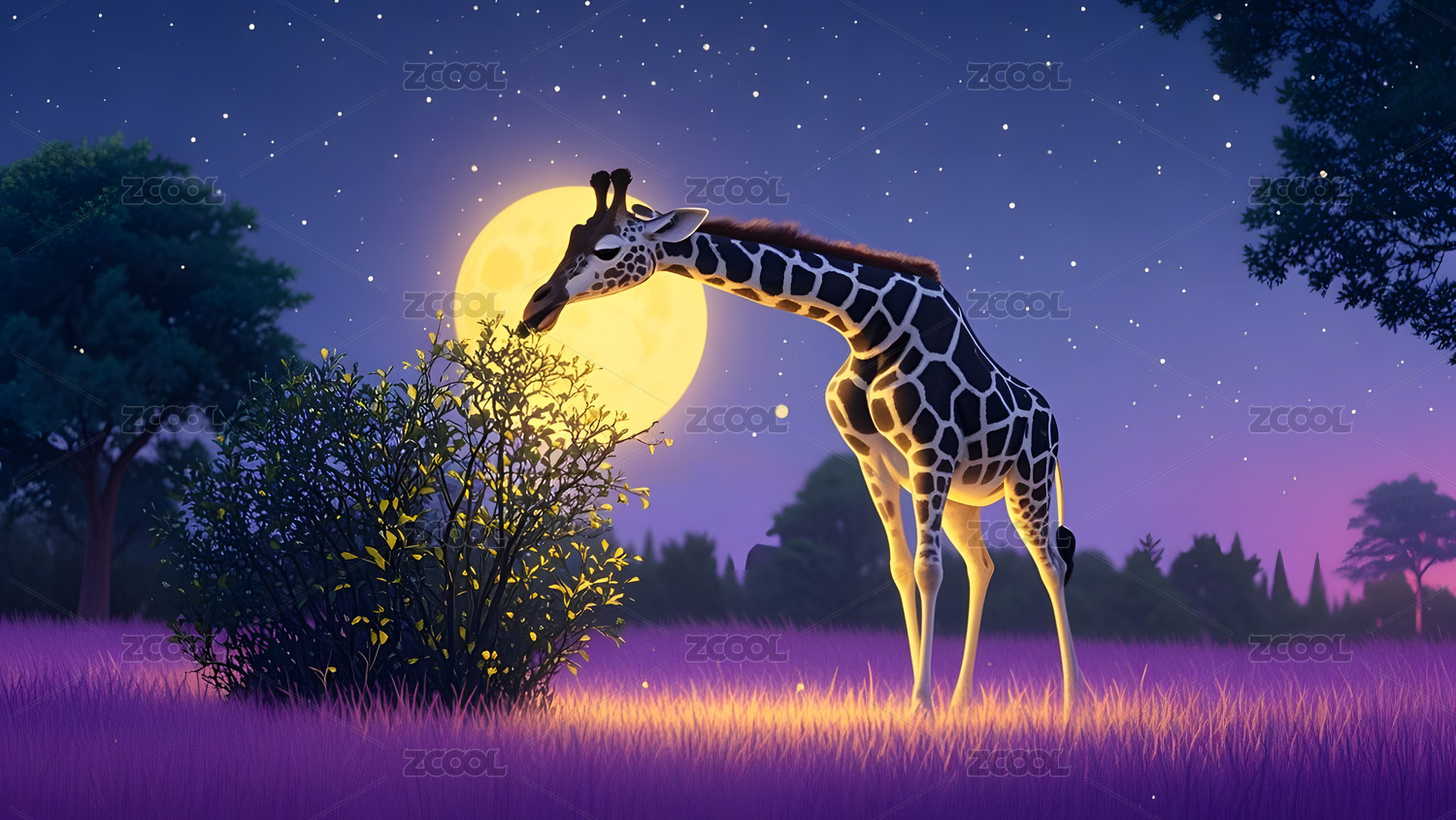 长颈鹿在月夜下展现优雅身姿