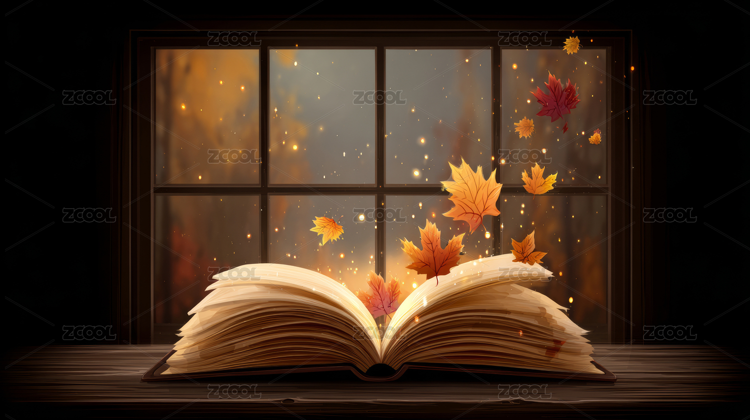 书页飘散秋叶的奇幻场景