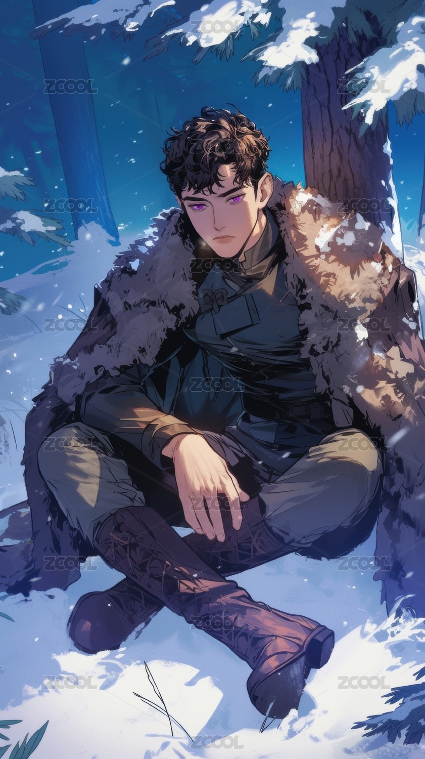 火焰环绕的少年在雪中凛冽而立