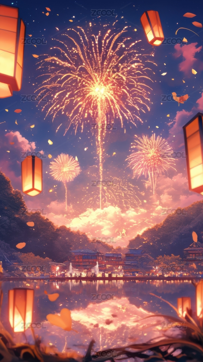 场景,建筑,梦幻,美丽,灯笼,烟花,夜空,节日,传统,色彩
